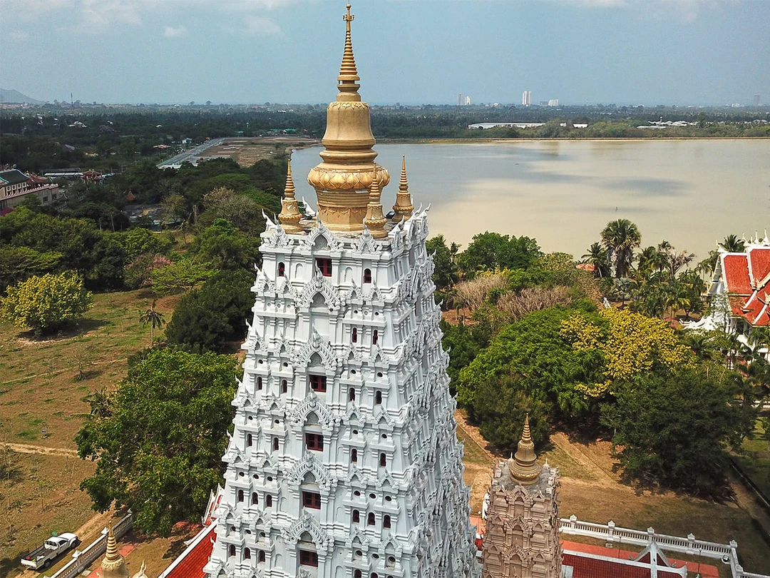 Уникальный архитектурный проект возвышается в небо на 105 метров и выполнен из железного и тикового дерева без единого гвоздя. Его строительство началось в 1981 году по инициативе тайского бизнесмена и продолжается до сих пор.