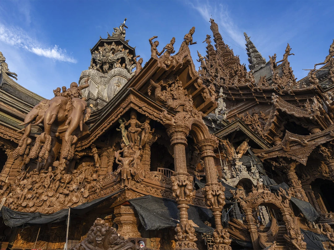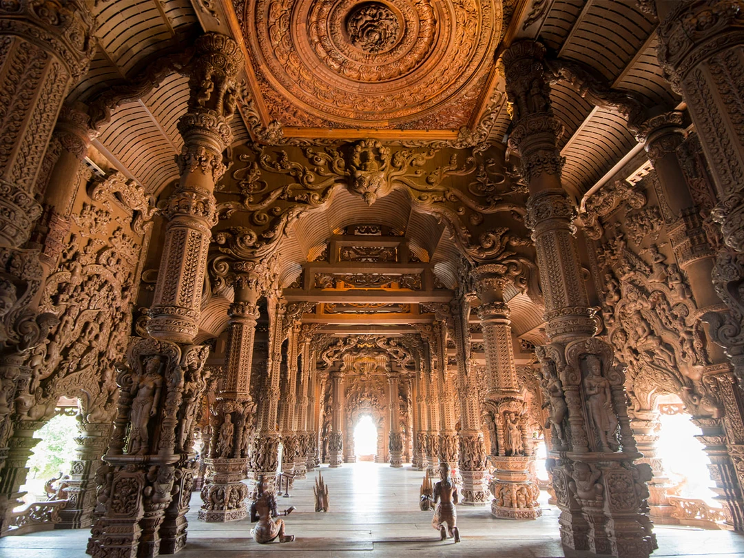 Здание украшено тысячами резных фигур и орнаментов с изображениями божеств, а также мифологических существ. Сюжеты заимствованы из буддийской, индуистской мифологии и из философии древних кхмеров, китайцев и тайцев. Они рассказывают о связи человека с космосом, о вечном противостоянии добра и зла, жизни и смерти, семейных ценностях.
