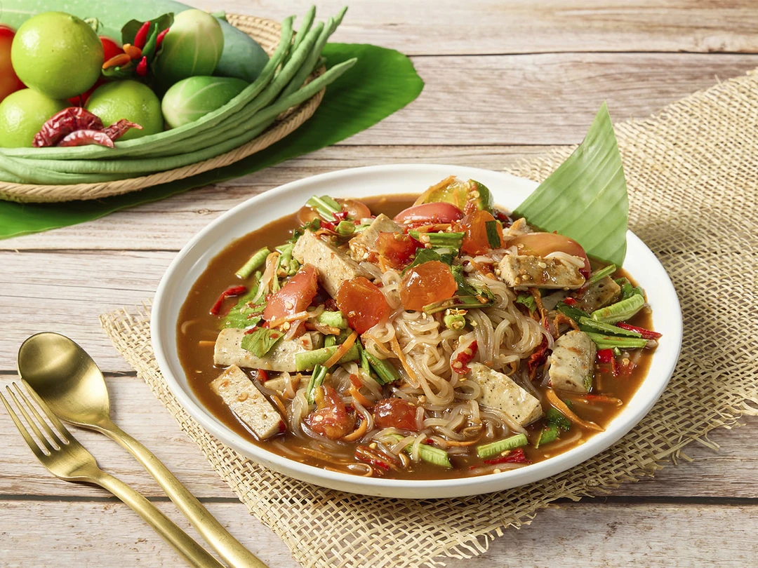 - Сом‑там — острый салат из зелёной папайи. Тёртая папайя в ступке смешивается с чесноком, чили, помидорами, стручковой фасолью, соком лайма, рыбным соусом и часто — сушёными креветками. Всё это обильно посыпается арахисом. Вкус — свежий, хрустящий, одновременно сладковатый и пикантный.