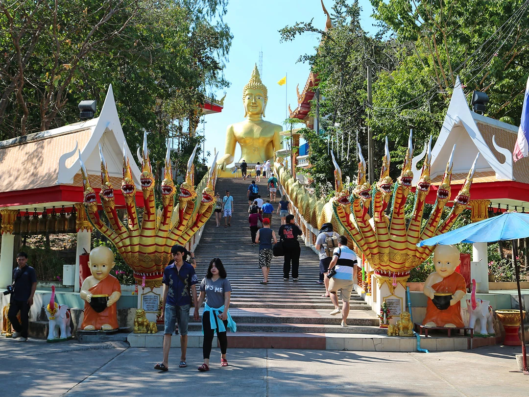 К Биг Будде ведёт широкая лестница с перилами, украшенными изображениями змееподобных существ — нагов. Подъём несложный, но в жаркий день лучше взять с собой воду и головной убор. Рядом со статуей есть смотровая площадка, с которой открывается захватывающий вид на всё побережье Паттайи и бескрайние воды Сиамского залива. Эта видовая точка — одна из лучших в городе для фотографий, особенно на закате.