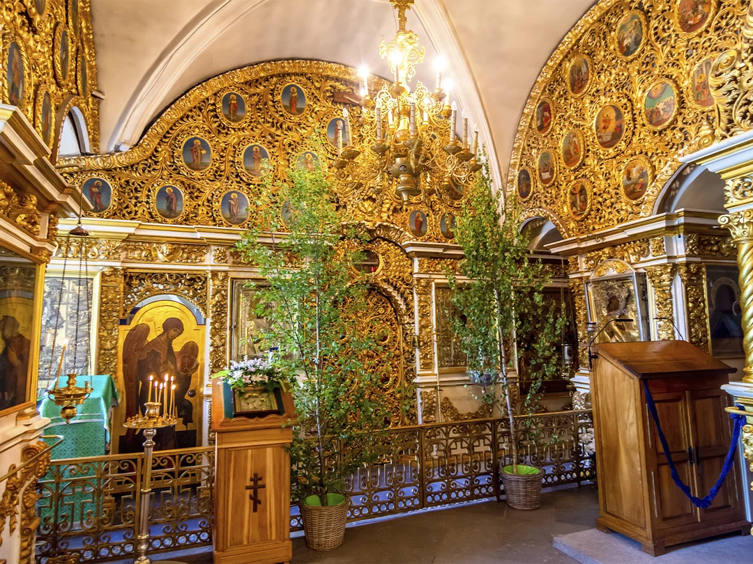 Внутри можно увидеть чудотворный образ Божьей Матери «Умиление» XVI столетия. Считается, что именно эта икона помогла защитить псковские земли от вражеских войск Стефана Батория. А ещё здесь хранится шкатулка с десницей мученицы Татианы — почитаемая святыня Псково‑Печерского монастыря.