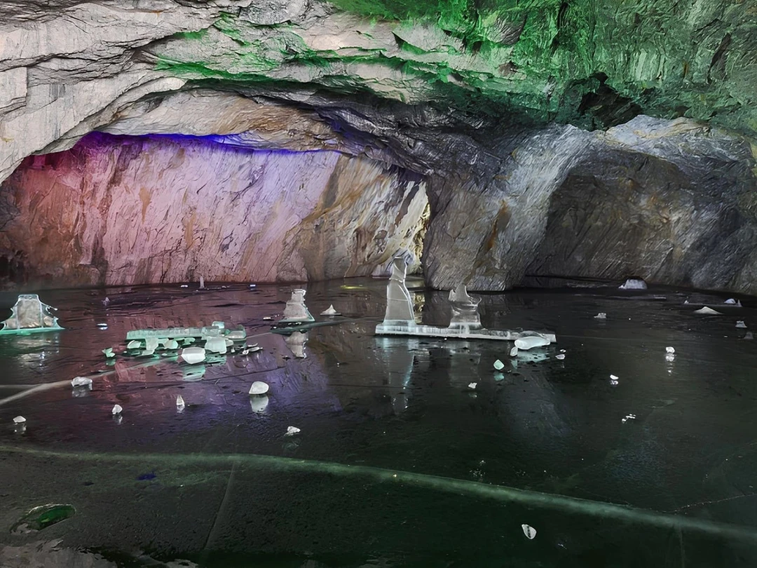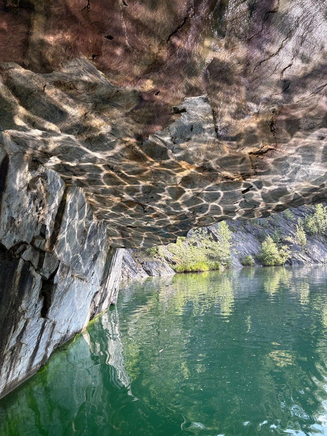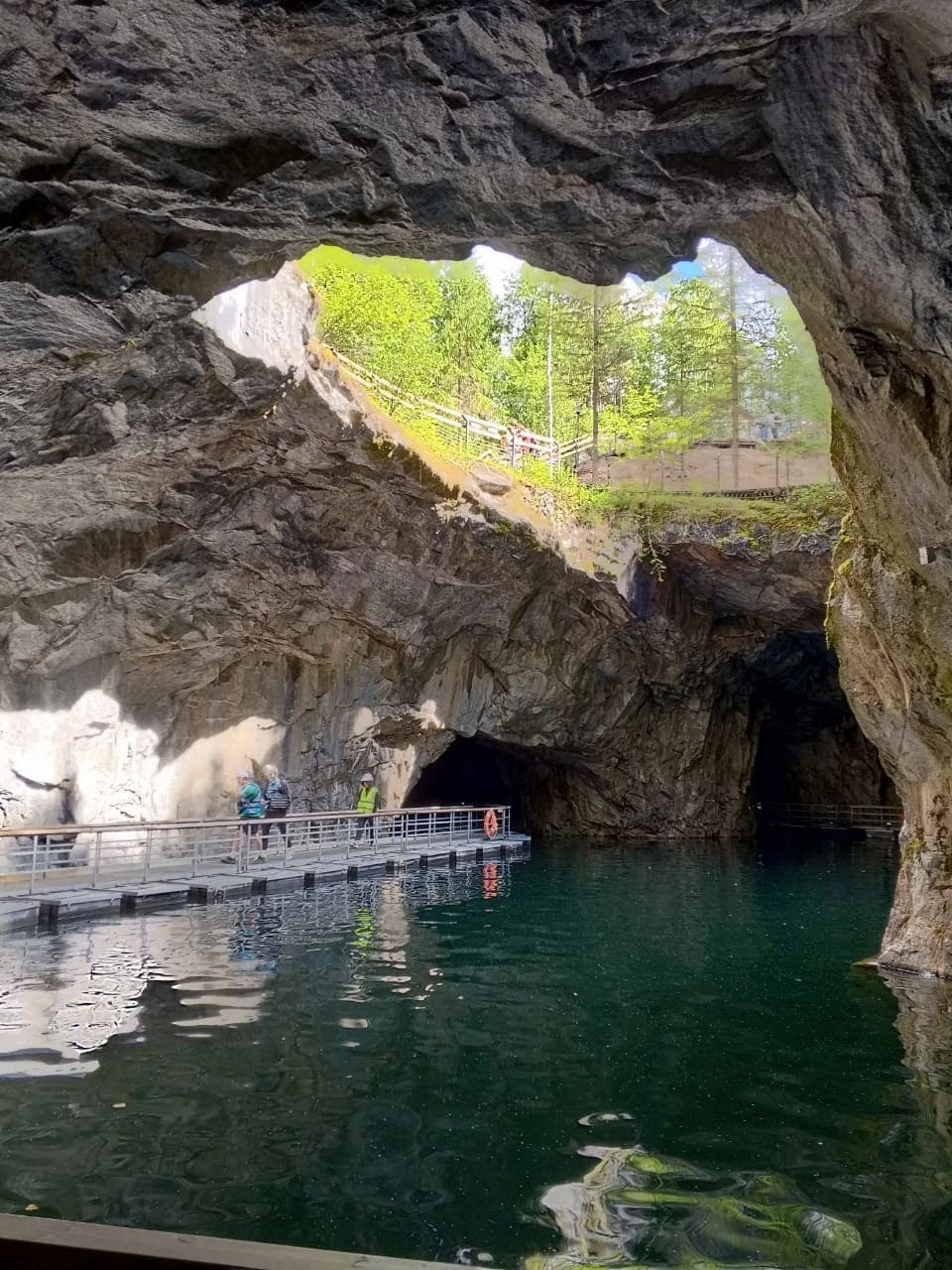 Почти ни одна экскурсия в «Рускеалу» не обходится и без посещения грота с подземным озером. Он образовался в результате обрушения штолен. В пещере всегда холодно — в самых отдалённых её уголках лёд не тает даже летом, — так что прихватите с собой куртку.