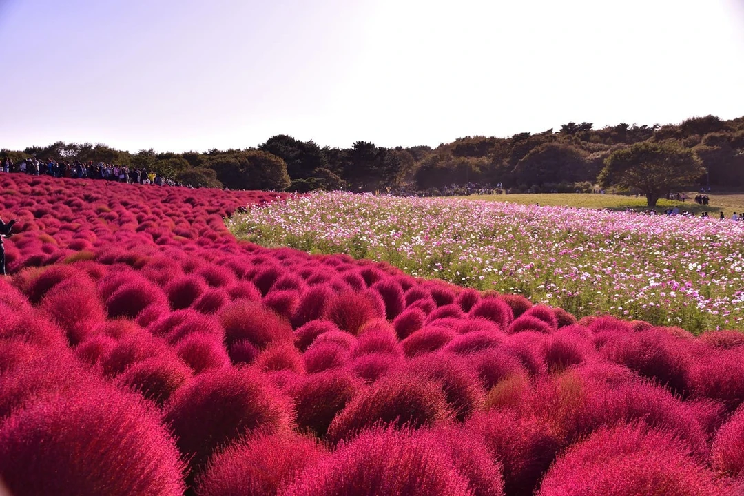 Весной здесь цветут нарциссы, тюльпаны и миллионы нежно‑голубых немофил, которые в мае превращают местные холмы в море, сливающееся с горизонтом. Лето наполняет парк яркими красками цинний и подсолнухов, а осенью на первый план выходят многочисленные разноцветные космеи и кохия.
