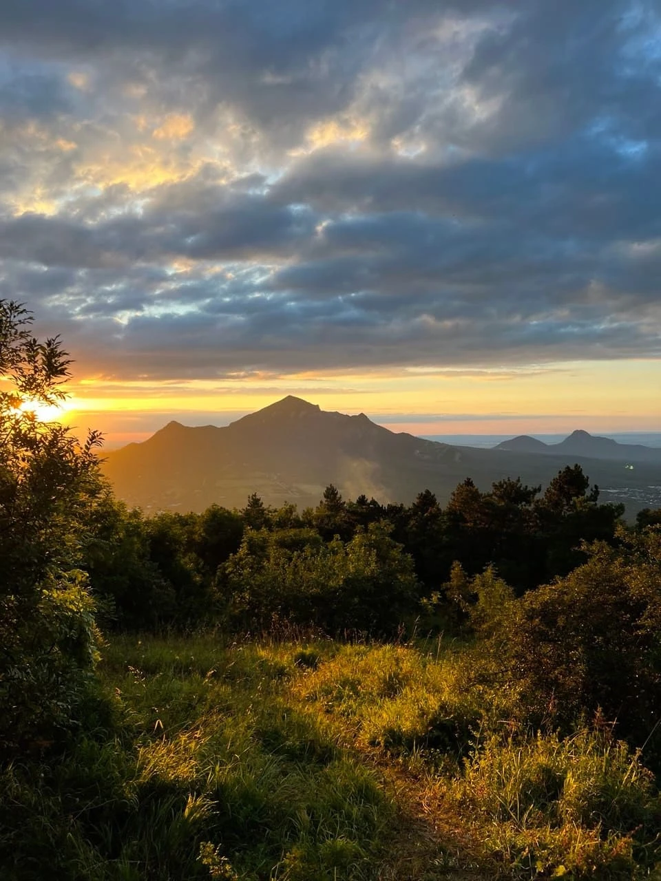 Гора Машук. Символ Пятигорска. С вершины открывается панорама всего города, соседних курортов и даже Эльбруса, если повезёт с погодой. Особенно красиво тут на рассвете и закате. Наверх можно подняться на канатке — она очень атмосферная. А можно дойти пешком.