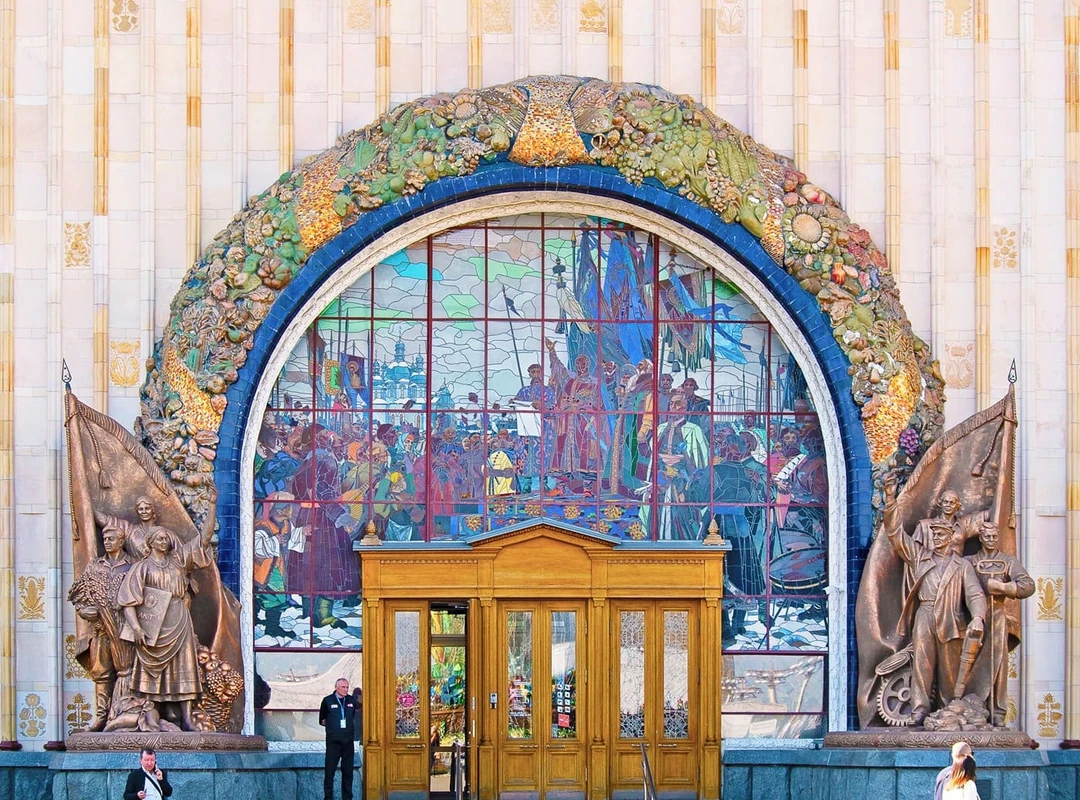 Внутри — просторные залы в стиле сталинского ампира. В советское время здесь выставлялись скульптуры, картины и фотографии, связанные с народными достижениями. Сегодня вход в залы закрыт, но время от времени они распахивают свои двери для официальных делегаций.