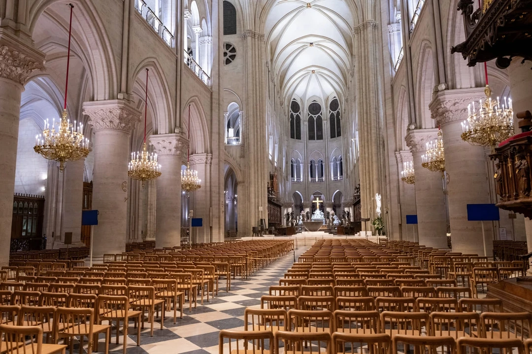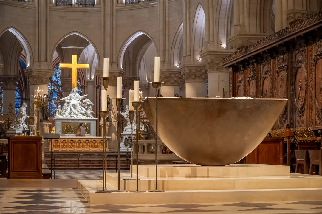 Впечатляет и внутреннее убранство собора: стрельчатые своды, ряды массивных колонн, более 100 витражных окон. Один из символов храма — статуя Девы Марии с Младенцем — красуется тут с XIV века. А вот бронзовый алтарь в форме перевёрнутого свода — творение современного скульптора Гийома Барде. Часть церковной мебели появилась в соборе после восстановления собора от разрушительного пожара 2019 года.