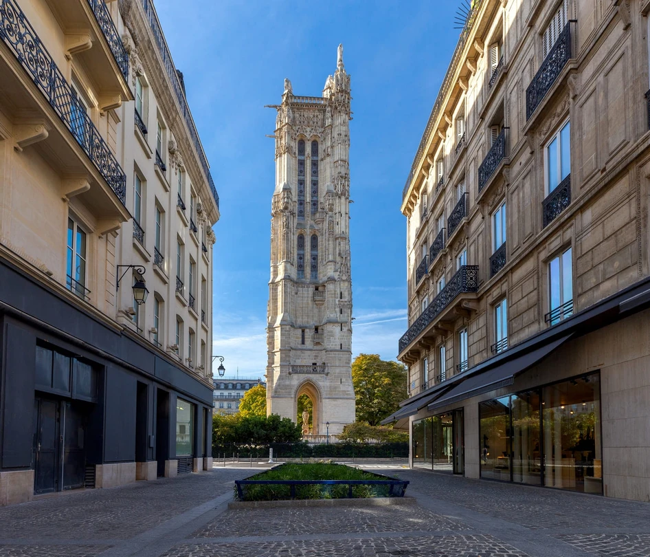 Двигаясь дальше по правому берегу Сены, вы сможете дойти до башни Сен‑Жак (Square de la Tour Saint-Jacques), которая возвышается над улицей Риволи. Эта готическая постройка XVI века долгие годы служила колокольней церкви Сен‑Жак‑ла‑Бушери. Но в конце XVIII века революционное правительство решило разобрать храм на камни, а вот 52-метровую башню не тронули.