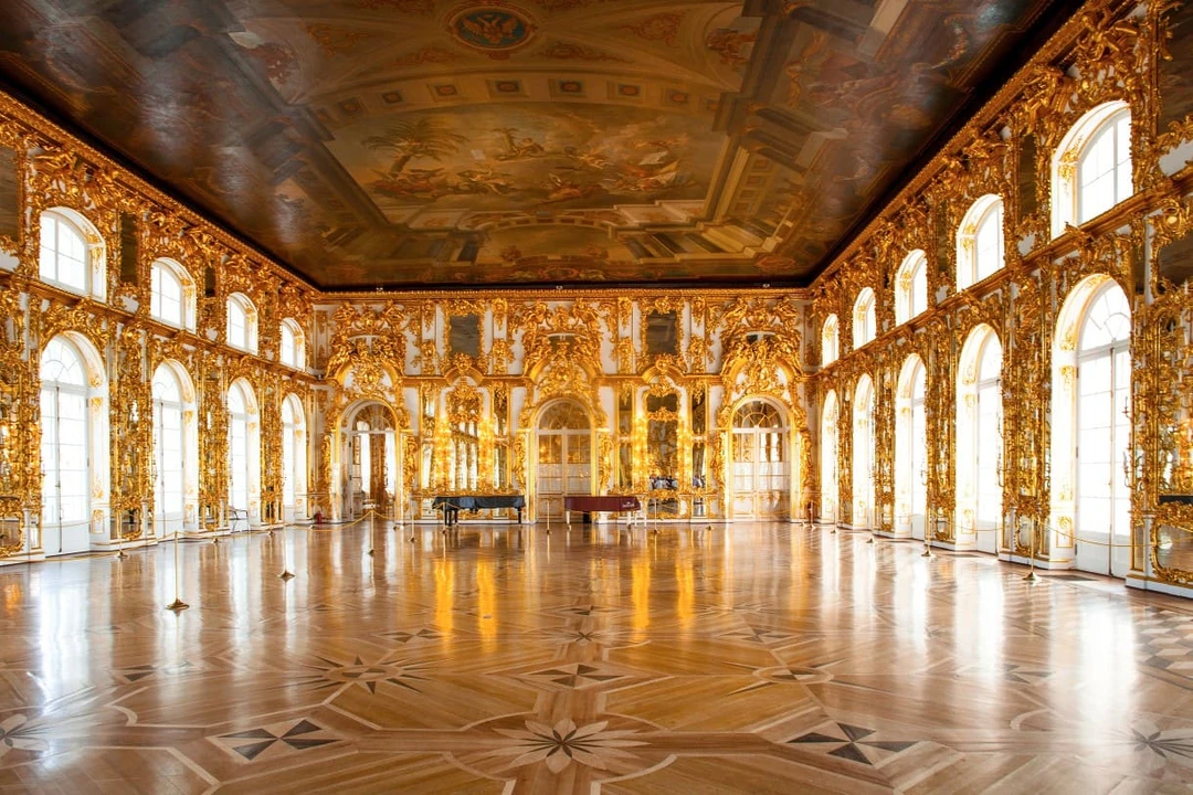 Ворота, через которые проезжают кареты гостей, почти полностью повторяют очертания реальных, а зал, где происходит бал, напоминает Большой зал дворца. Художники значительно увеличили высоту потолков, чтобы пространство выглядело более величественным. Но общие очертания — двухъярусные окна, богатую золотую лепнину и даже узор на паркете — нарисовали довольно узнаваемыми.