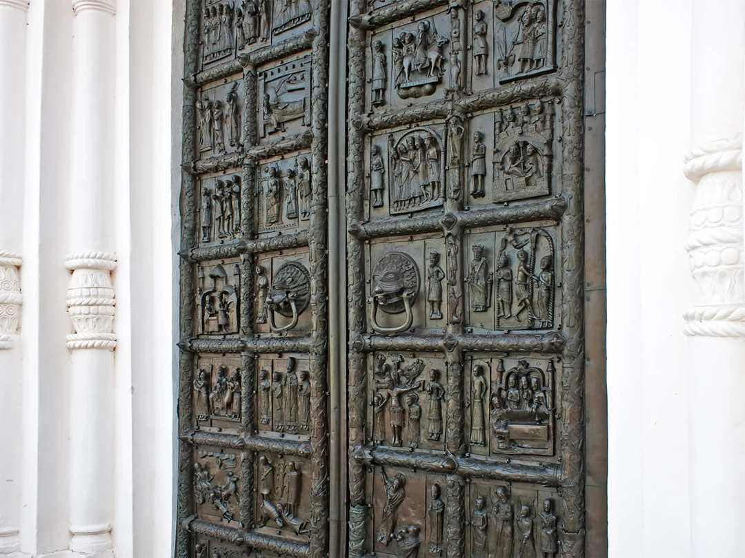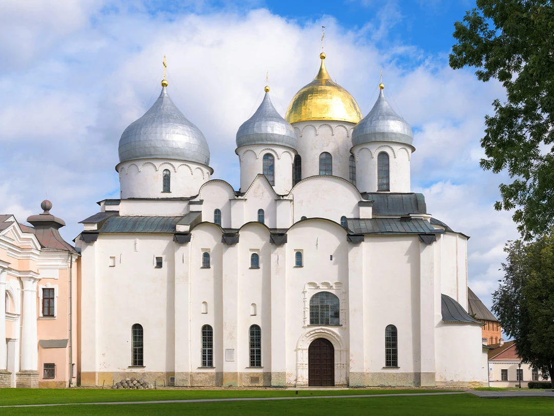 Одно из самых известных и древних зданий на территории кремля — великолепный Софийский собор. Его возвели в середине XI века новгородские и византийские зодчие как символ могущества Новгорода. Величественный храм венчают шесть куполов, своей формой напоминающие шлемы древнерусских воинов. В западной части строения сохранились Магдебургские врата с рельефными изображениями сцен из библейских писаний. Их изготовили из бронзы в XII веке в Германии для католического собора, а в Новгород они попали как военный трофей.