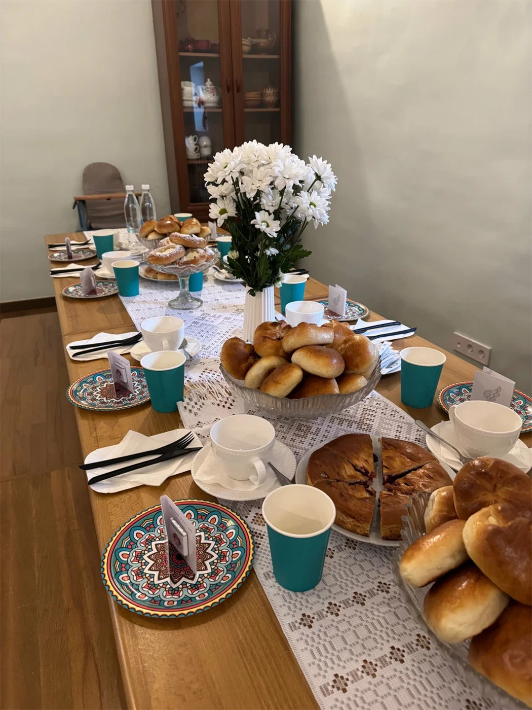 Несмотря на довольно светскую и расслабленную атмосферу, кафе устроено с опорой на христианские традиции. Например, все столы в зале можно сложить в один общий — это отсылка к классическим трапезным, где все едят вместе после богослужения. Кроме того, в мебель зашифровано послание. В каждую столешницу инкрустирована мозаика, и если её части соединить, то можно прочесть цитату из Библии: «Блаженны алчущие и жаждущие правды».