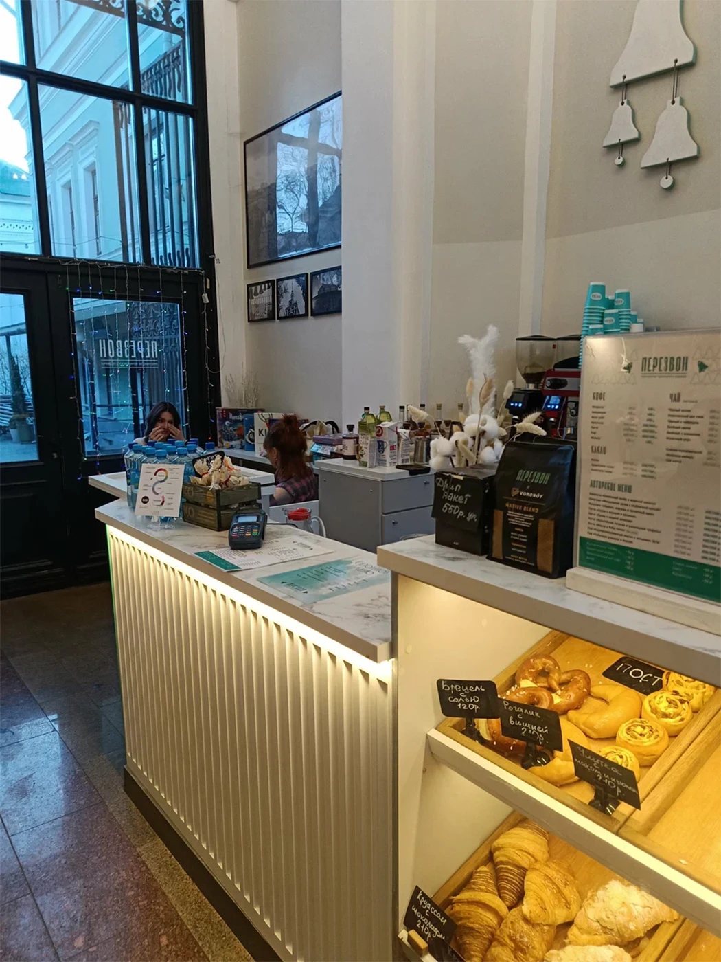 Сегодня здесь бывают не только прихожане, но и кофеманы. В «Перезвоне» можно купить раф или латте, а также авторские напитки. Например, капучино со вкусом халвы и клубники и кокосовое какао. Есть и десерты: сицилийские канноли, чизкейк «Сан‑Себастьян» и другая выпечка. Здесь можно разместиться в маленьком (всего на пять человек) зале с высокими сводами и роскошной церковной люстрой — паникадилом, а в тёплое время года — во дворе в окружении деревьев.