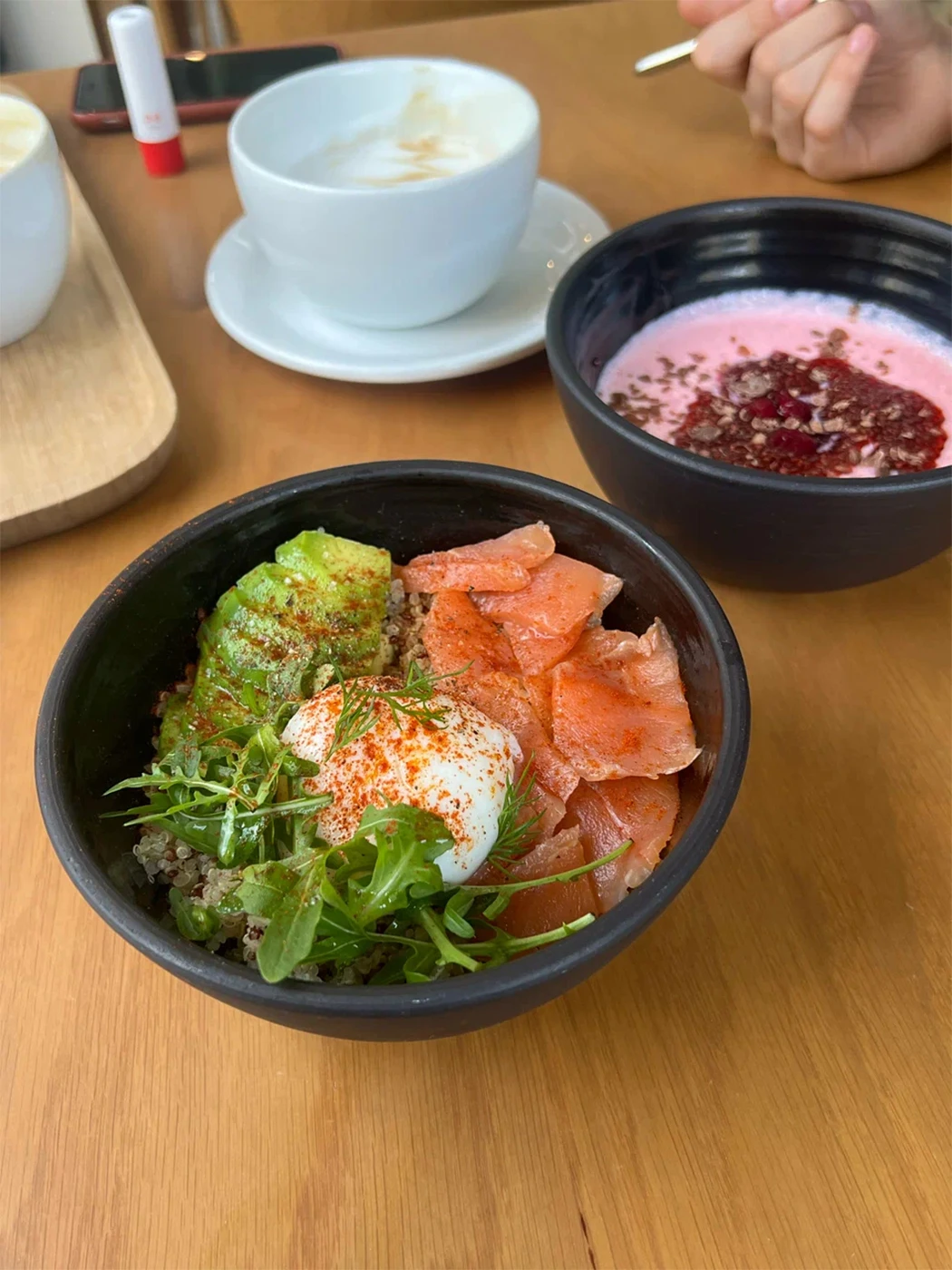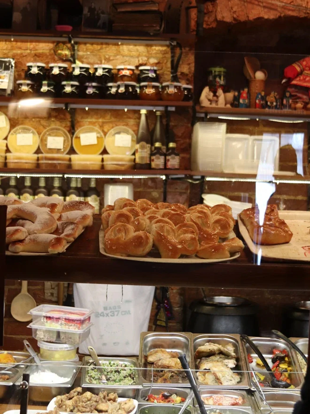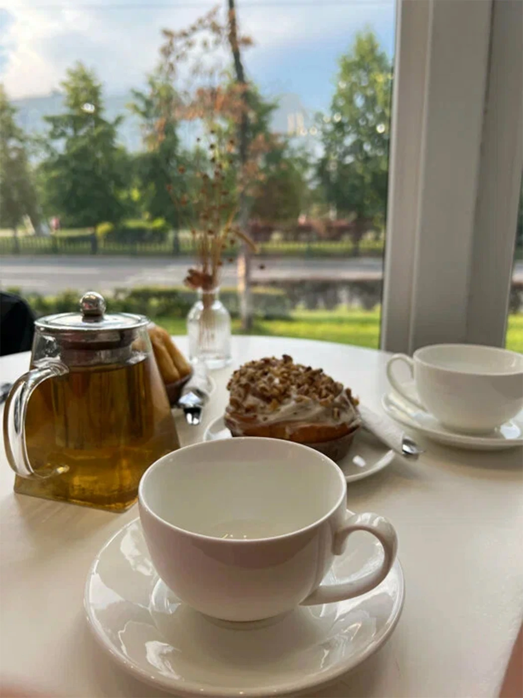 Здесь можно встретить не только прихожан, но и ценителей искусства, заглянувших после выставки, чтобы выпить раф, латте или фильтр‑кофе, съесть сэндвич или круассан с лососем. В меню также есть сладкая выпечка и горячие блюда — вариации на тему русской кухни: например, булгур с северными ягодами и грибами и перловая каша с индейкой.