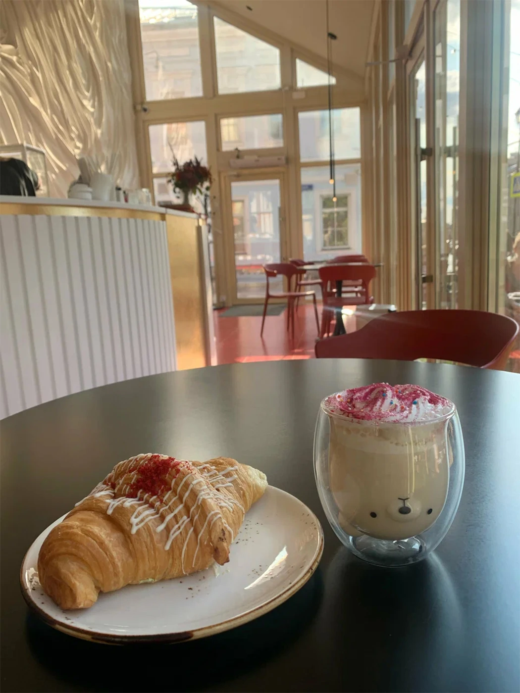 В меню — классический кофе и необычные некофейные позиции. Например, мятно‑кокосовая матча и вишнёвый пунш. Также в «Ионе» предлагают десерты шу, эклеры и сладкую выпечку.