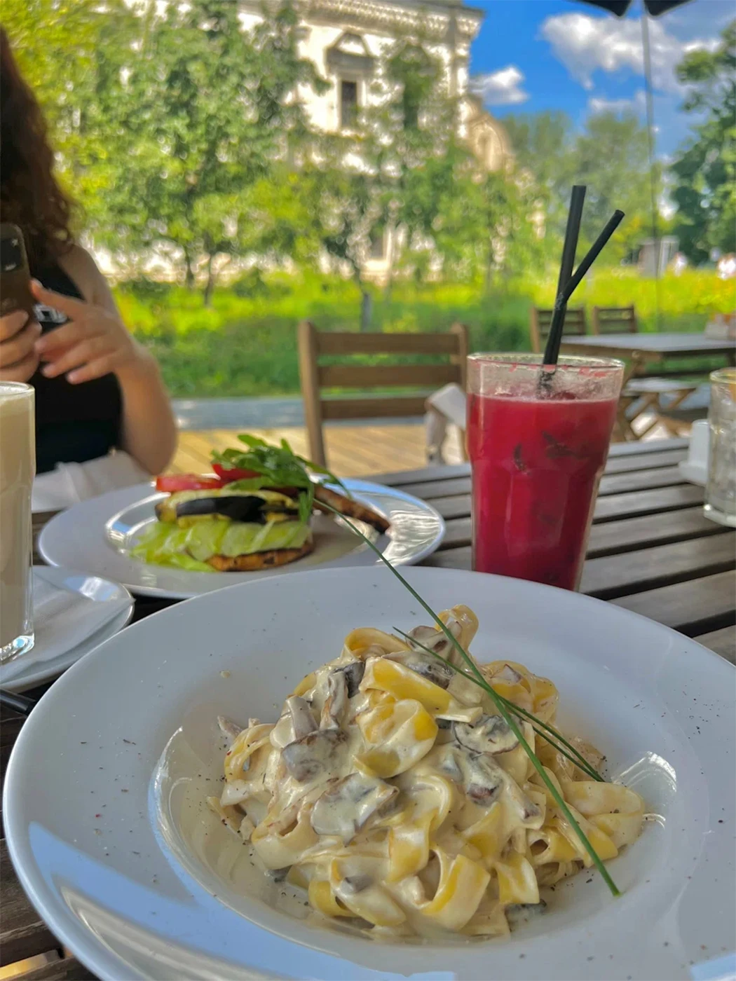 В музейном кафе, открытом в старинном здании, — полноценное меню с горячими блюдами, супами, салатами, закусками и десертами из русской и европейской кухонь. Тут можно отведать щи, селёдку с отварной картошкой, гречку с грибами или даже заказать пиццу и пасту. А если приедете в музей с утра, то в кафе можно позавтракать рисовой или овсяной кашей, сэндвичем, сырниками или омлетом.