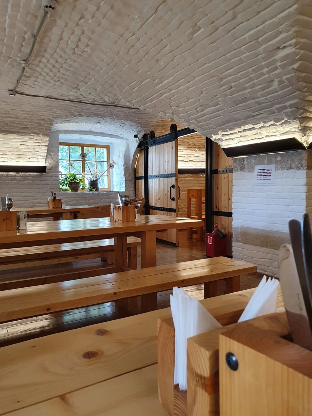 После осмотра старинных построек и соборов, один из которых расписывал сам Рублёв (кусочек фрески сохранился только в заалтарной части), и экспозиции, где собраны уникальные предметы древнерусского искусства, в самый раз подкрепиться в местной трапезной.