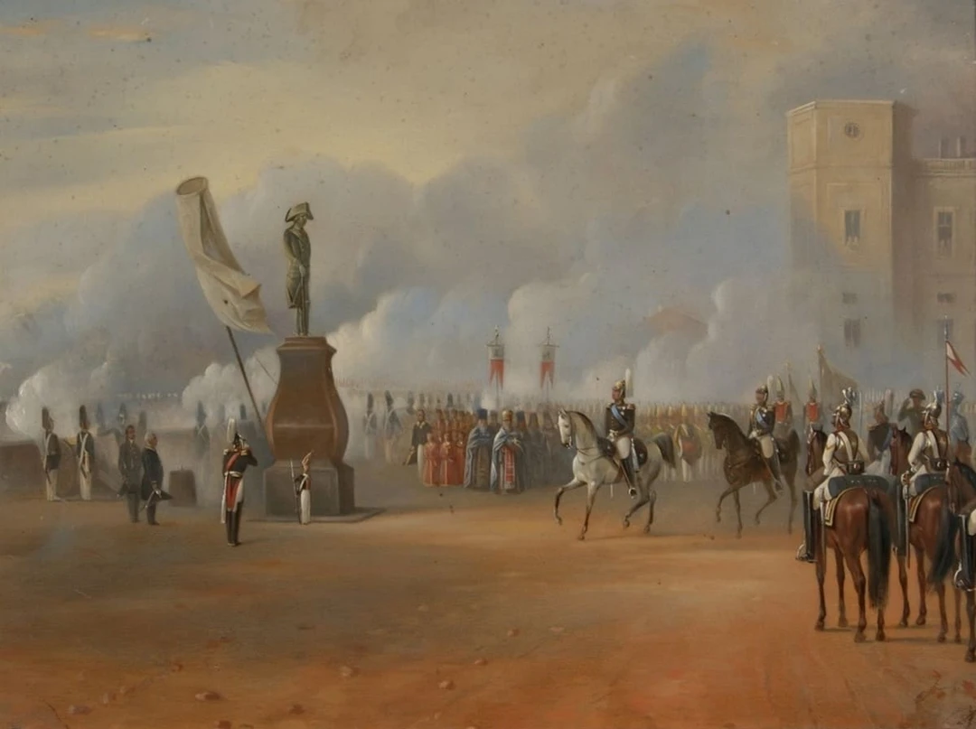В центре композиции начертан текст постановления Сената и Синода о возведении памятника русскому царю — это письмо датировано 1814 годом. Через 15 лет Николай I объявил конкурс на создание монумента в память о своём брате. Победителем стал Огюст Монферран с проектом Александровской колонны, которую поставили перед Зимним дворцом.