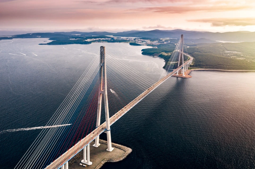 Один из самых узнаваемых в нашей стране: он изображён на 2000‑рублёвой купюре. Переброшенный через пролив Босфор Восточный мост соединяет остров с материковой частью столицы Приморья. Его возводили с 2008‑го по 2012‑й. Общая длина вантовой конструкции — почти два километра, а высота пилонов — 324 метра.