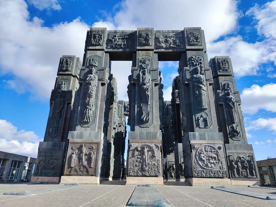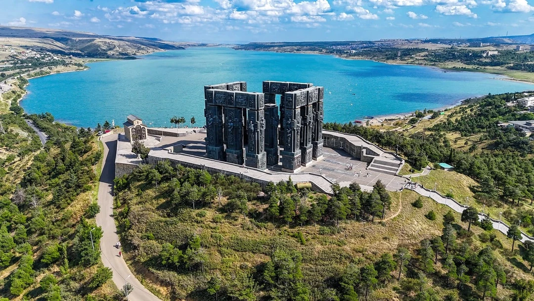 Тбилисское море окружено холмами, на одном из них высится монумент «Хроники Грузии» или, как его часто называют, грузинский Стоунхендж. Это скульптурный ансамбль из бронзовых и медных 35‑метровых колонн. Сюжеты барельефов на них меняются в зависимости от яруса: на нижнем — религиозные изображения, на среднем — портреты известных грузинских царей, а на верхнем — бытовые сцены (сбор урожая и праздники). Проектировал величественный монумент известный скульптор Зураб Церетели в середине 1980‑х, а строительство затянулось практически на двадцать лет: открыли комплекс в 2003 году.