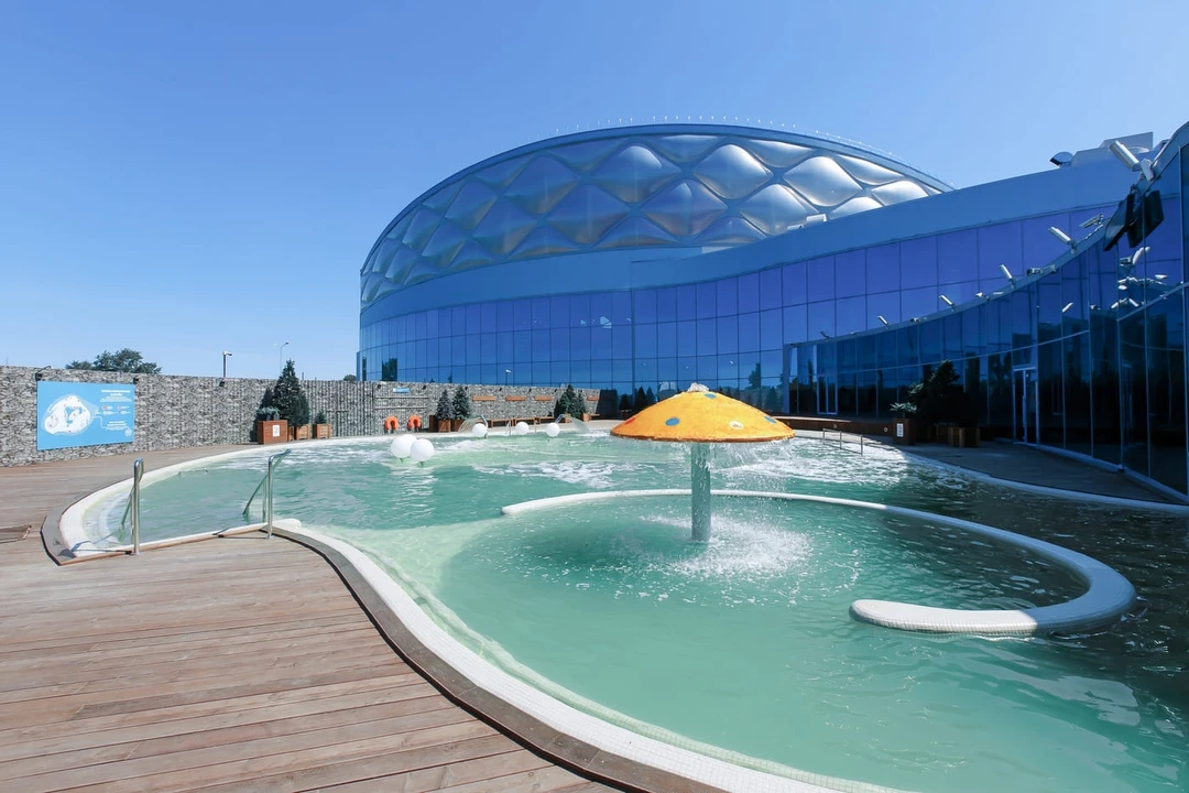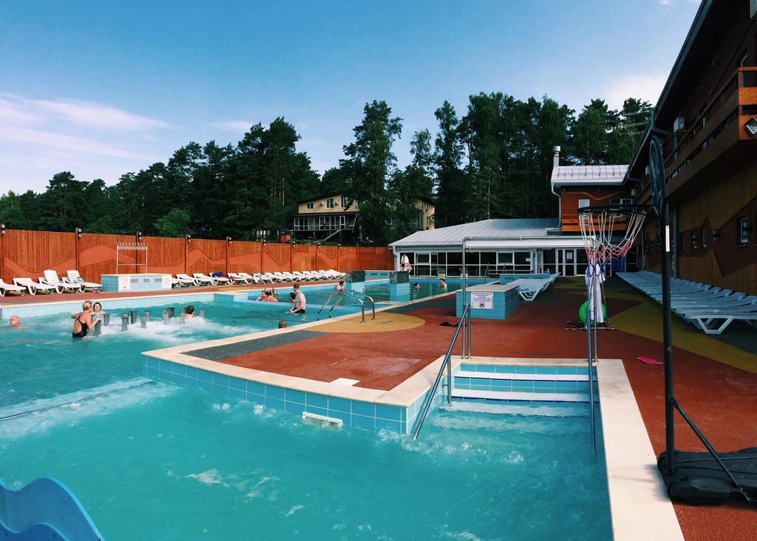 На территории терм легко найти себе занятие и детям, и их родителям. Для маленьких гостей есть игровая площадка и батуты, зимой для них строят ледяную горку. Взрослые могут провести время на волейбольной площадке, в гриль‑беседках или покататься по озеру на сапборде или катамаране. А ещё можно рассмотреть необычный дизайн базы отдыха в эстетике СССР. Главное здание внешне напоминает советский Дом культуры, а рядом с входом работает небольшая выставка ретроавтомобилей. Даже музыка в купальной зоне звучит соответствующая — пока вы в бассейне, слушать будете хиты 80‑х и 90‑х годов прошлого века.