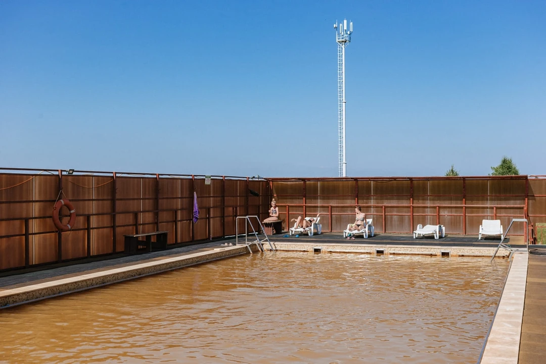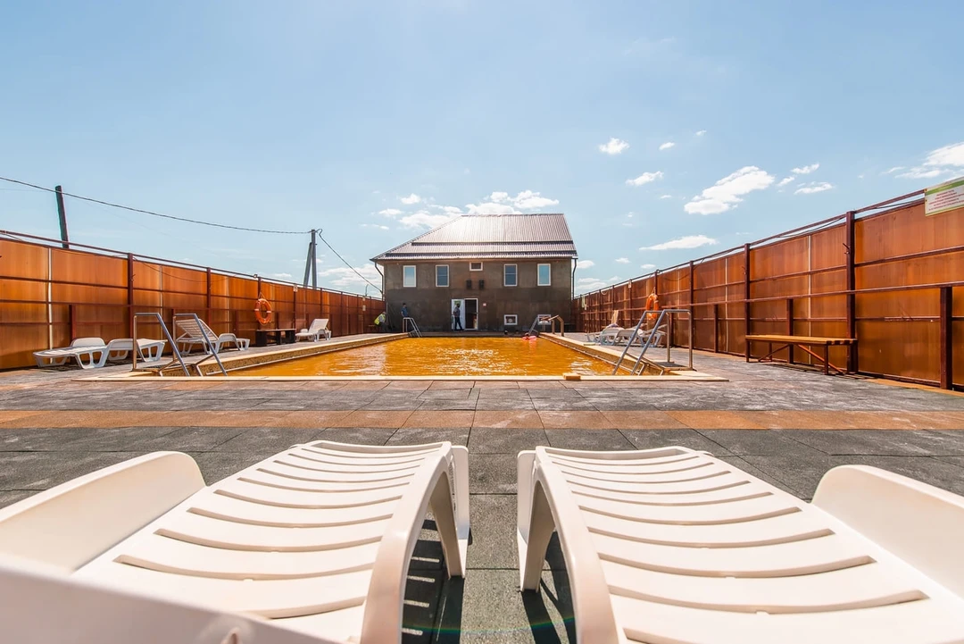 Сейчас сюда едут ради большого бассейна с водой ярко‑рыжего цвета. Температура хлоридно‑натриевой воды здесь круглый год держится на уровне +45°С, а купание в ней будет полезно практически при всех болезнях. Выделенной зоны для детей в бассейне нет, а его глубина плавно увеличивается от 1,4 до 1,6 метра. Рядом есть раздевалки с душевыми, буфет с напитками, выпечкой и снеками.