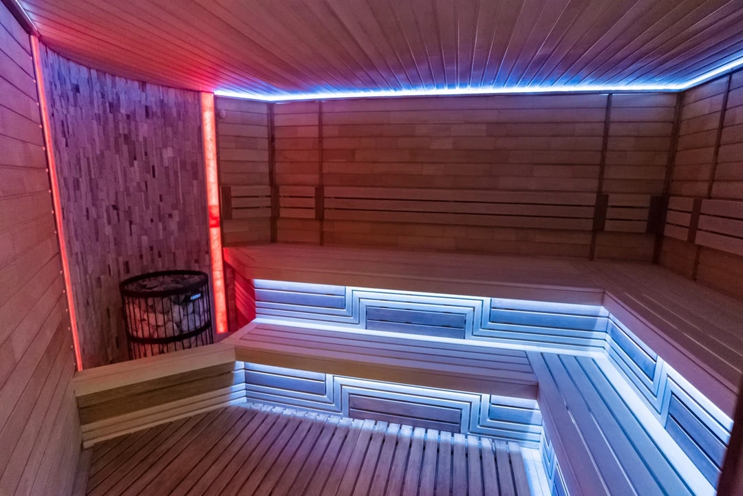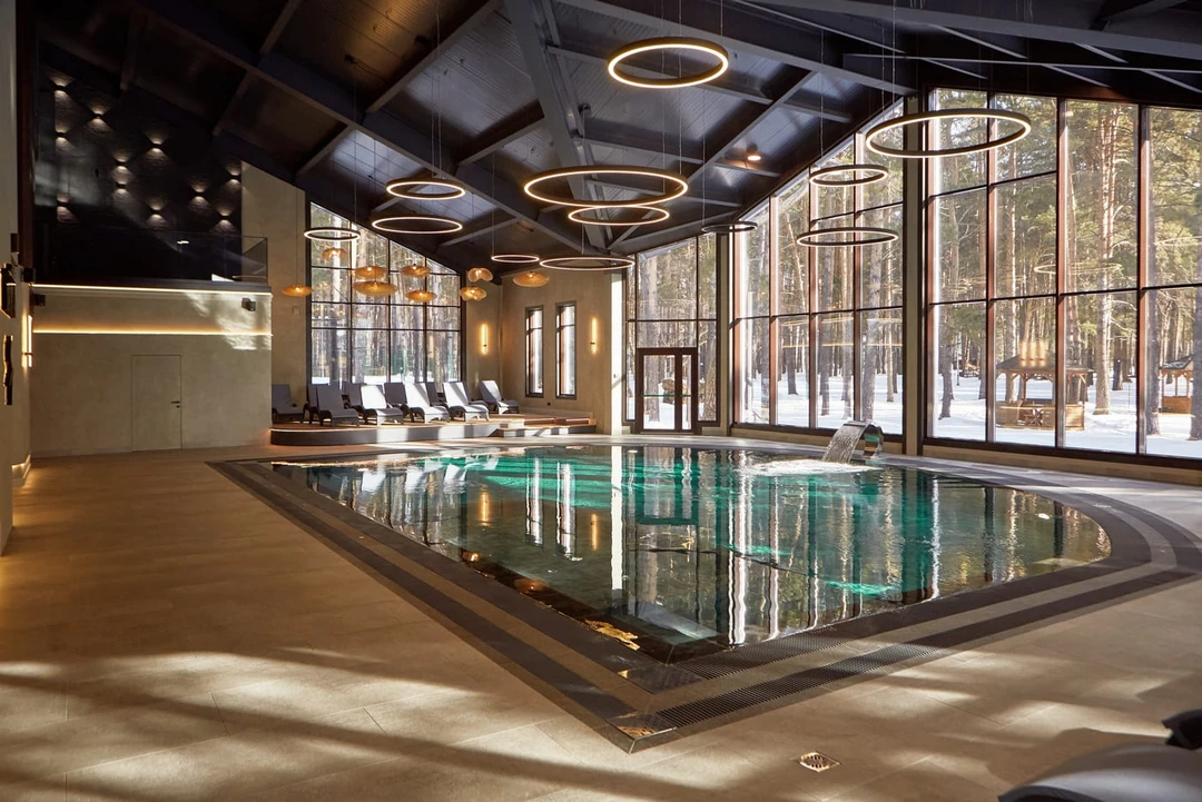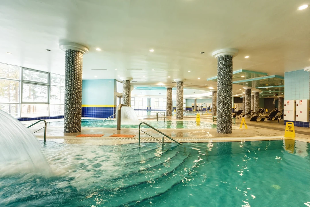 Ещё один бассейн с минеральной водой, прогретой до +36°C, расположен в помещении с панорамными окнами, откуда можно любоваться лесом. Помимо этого, в спа‑комплексе гостям предлагают различные оздоровительные процедуры: бани, фитосауны, хаммам, соляную пещеру и бювет с питьевой минеральной водой.