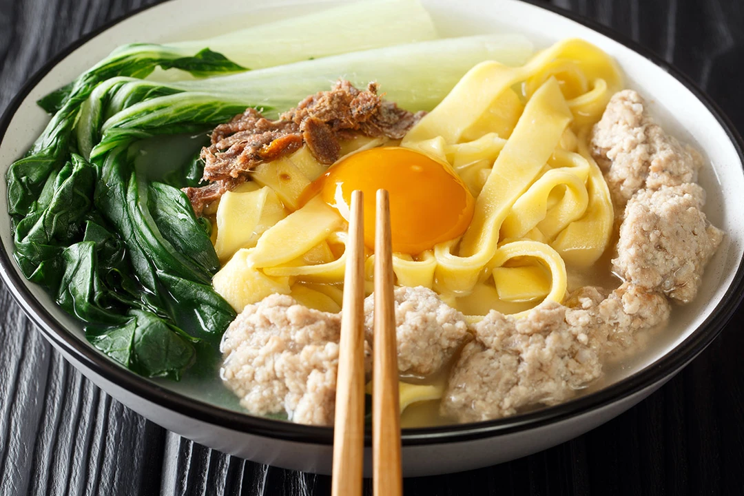 Бюджетный вариант китайского супа, который понравится почти всем. Это лапша, отваренная в мясном бульоне, которую подают как горячей, так и холодной. Главная особенность этого блюда — возможность добавить в него любые ингредиенты. Как и в случае с хого, к баньмянь с лапшой предлагают топпинги: мясо, яйца, соевый сыр, овощи или всё сразу.