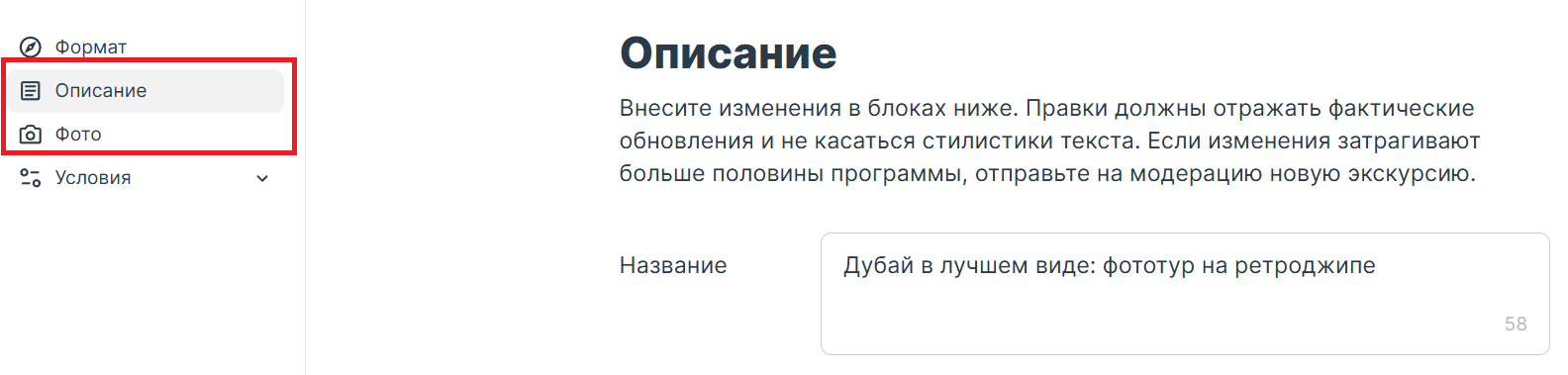 2. Откроется режим редактирования. На панели слева выберите вкладку «Описание» и/или «Фото» и внесите нужные изменения. Пожалуйста, не удаляйте символы, нужные для вёрстки (*, h3, _ )