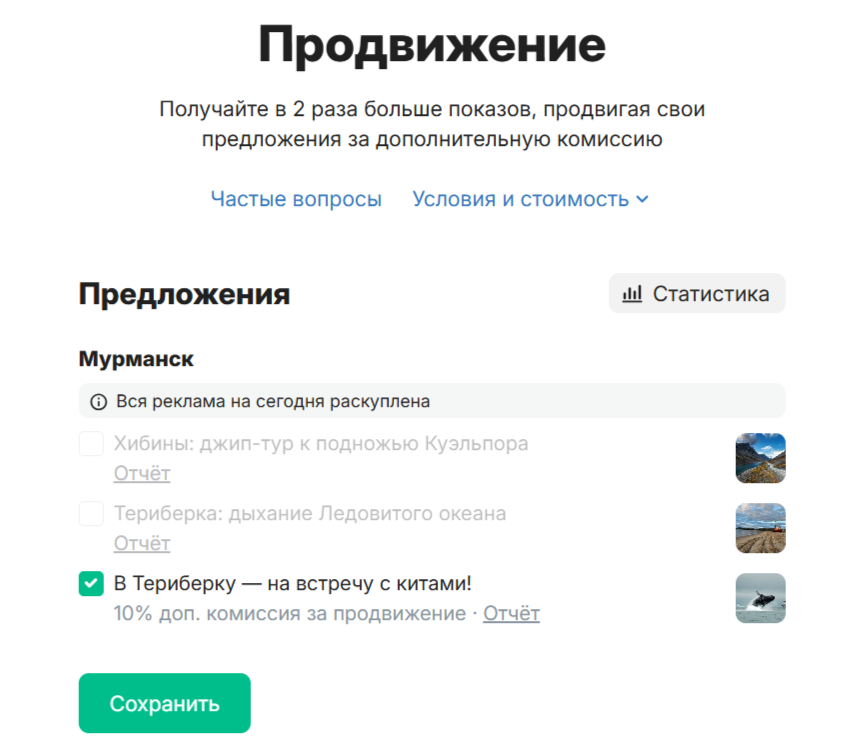 На сайте в личном кабинете во вкладке «Продвижение» отметьте галочками те экскурсии, которые хотите поднять в выдаче на странице города или рубрики.
