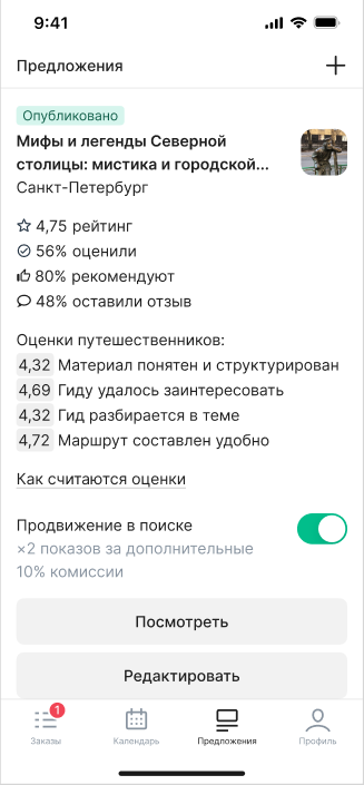 В мобильном приложении перейдите в раздел «Предложения», раскройте карточку нужной экскурсии и подключите продвижение, если оно доступно.