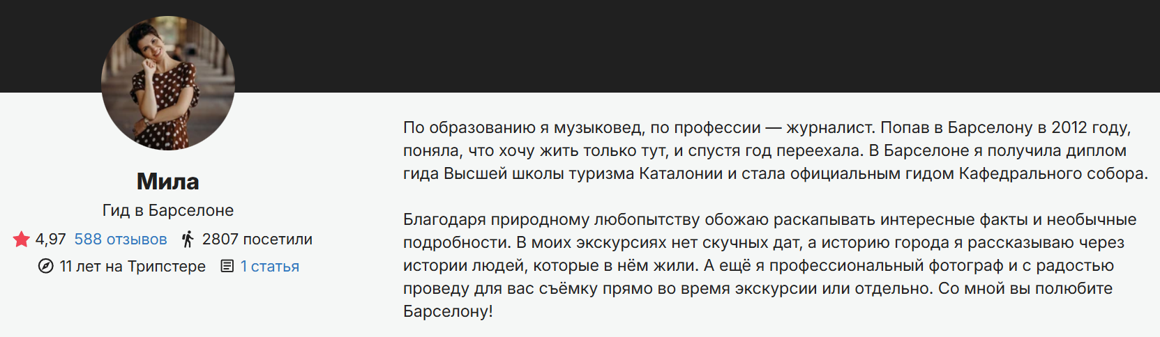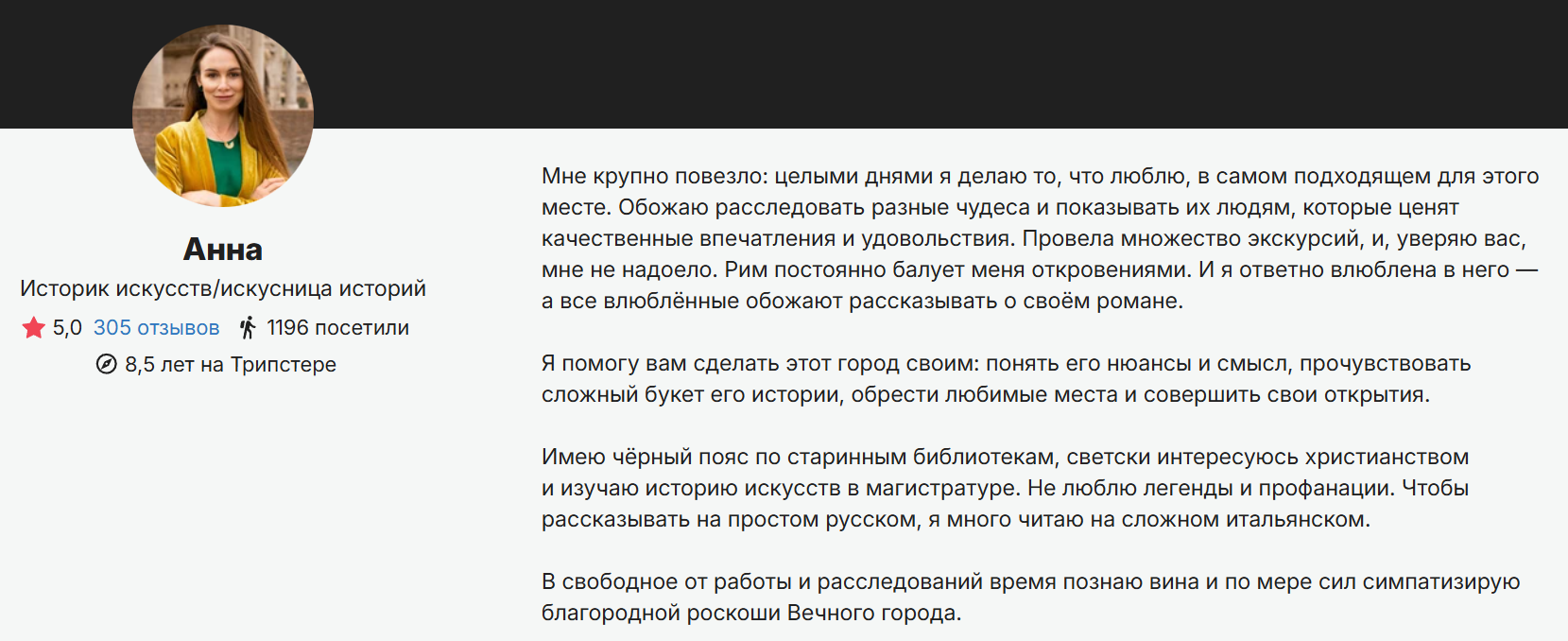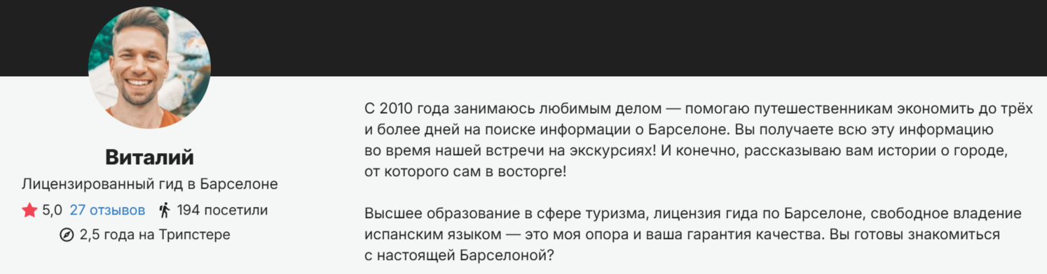 Наши исследования подтверждают: большинство путешественников читают описание о гиде. Часто это решающий фактор при выборе экскурсии. Ниже рассказываем, как составить ваш идеальный текст о себе и привлечь свою аудиторию.