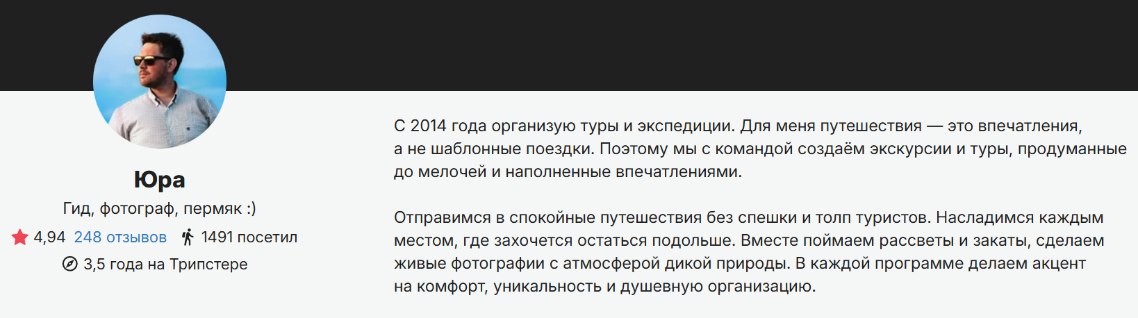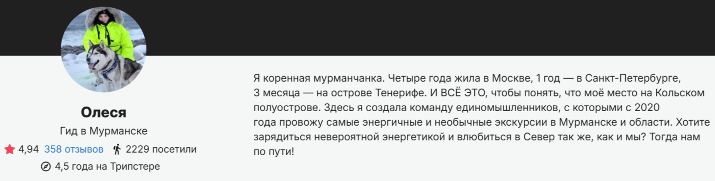 Что писать? Эта подпись — ваша возможность выделиться и запомниться путешественникам. Достаточно 2−3 слов, которых помогут понять, кто вы как гид. При этом подпись должна быть понятной и не порождать новых вопросов. Вот несколько примеров для вдохновения: