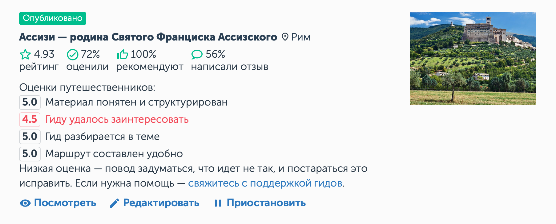 Рейтинг помогает путешественникам найти лучшее предложение, а гидам — привлечь больше заказов: чем показатель выше, тем чаще экскурсию выбирают. Согласно нашим исследованиям, наибольшее доверие вызывают предложения с рейтингом от 4,5.