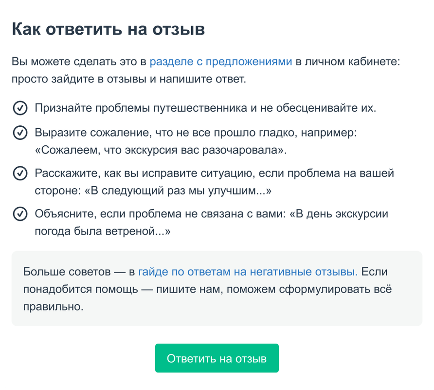 Количество отзывов влияет на доверие путешественников к предложению: чем отзывов больше, тем охотнее экскурсию заказывают. Старайтесь держать этот показатель не ниже 25% для индивидуальных экскурсий и 15% для групповых.