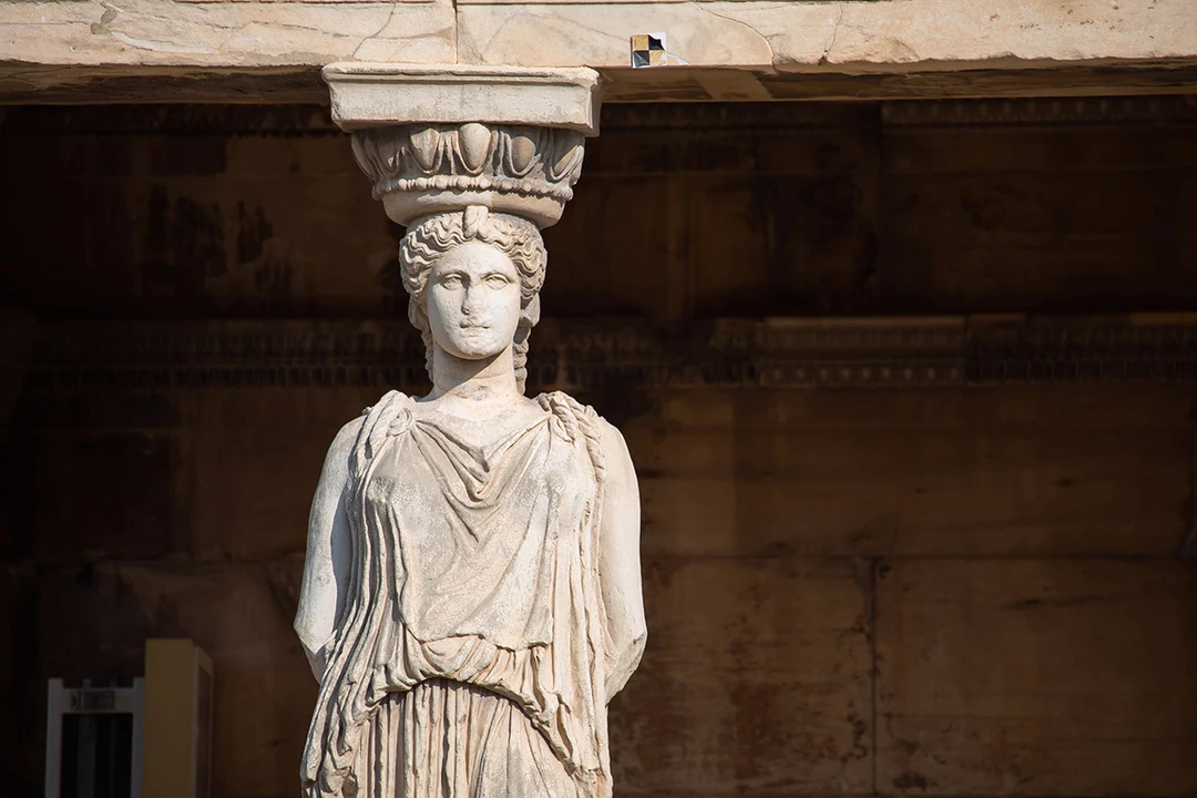 Самый примечательный элемент на фасаде Эрехтейона — кариатиды. Женские фигуры, подпирающие свод, выполнены с предельной детализацией. Сейчас на Акрополе можно увидеть лишь копии скульптур: четыре оригинала выставлены в музее комплекса, а ещё один в Британском музее.