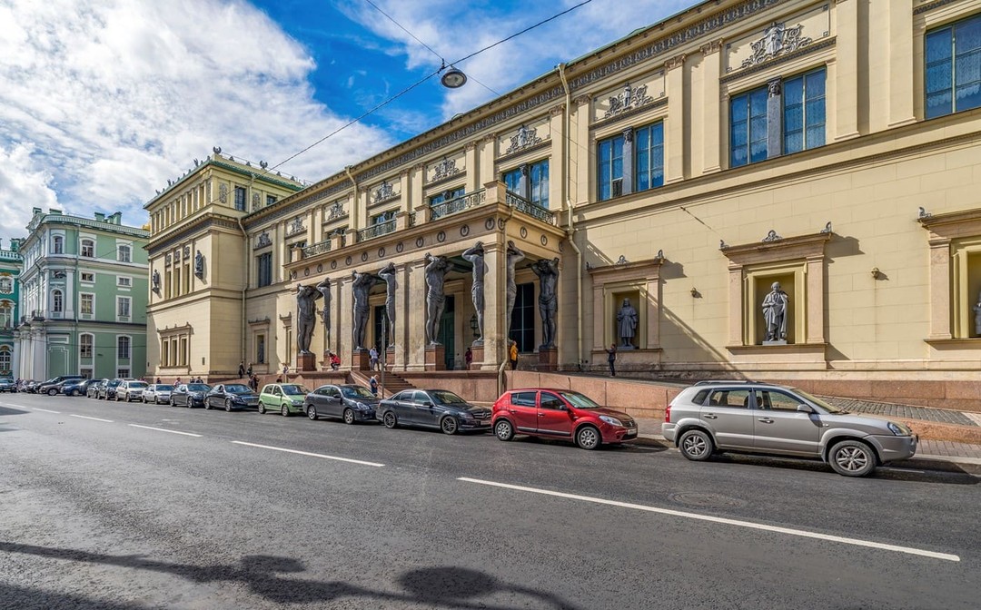 10 гранитных исполинов с суровыми лицами «держат» балкон Нового Эрмитажа. Музей расположен по адресу: Миллионная улица, 35.