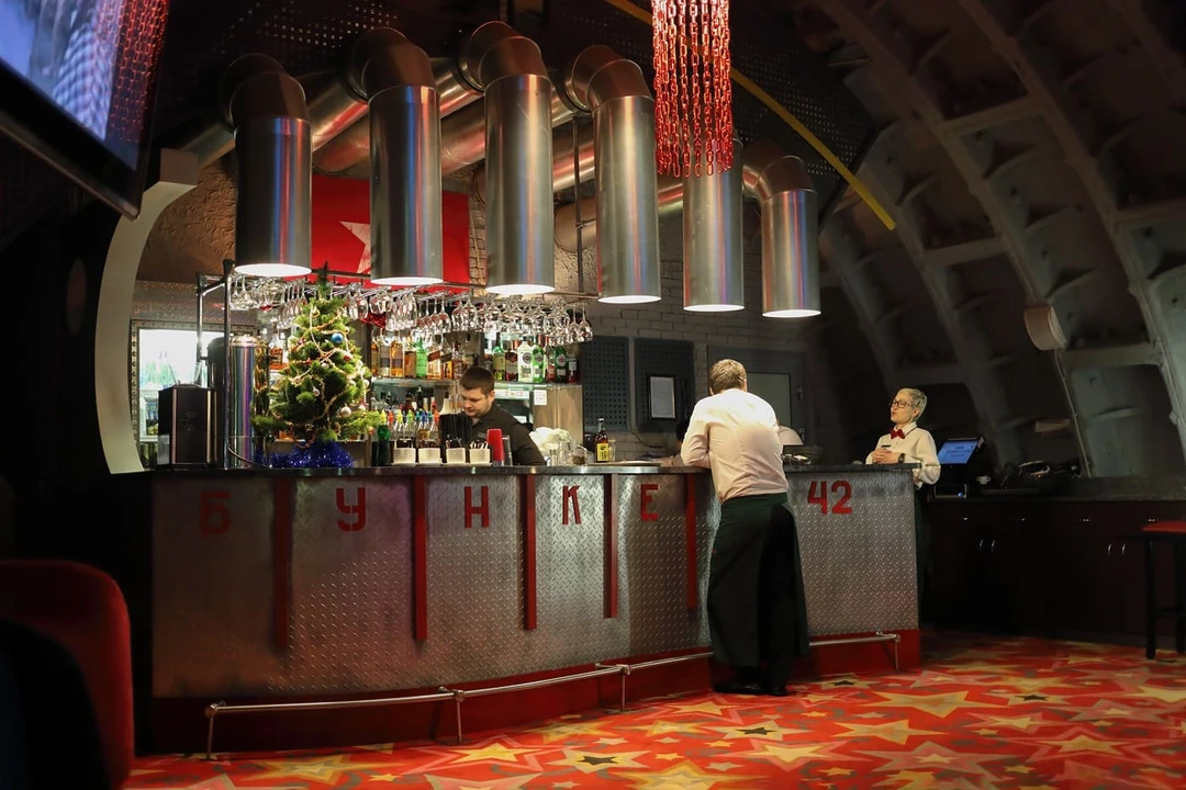 Он делится на несколько тематических зон: от генеральского кабинета с роскошными мягкими креслами до курительной комнаты. В декоре используется характерная атрибутика времён СССР, из колонок доносятся советские музыкальные хиты, а по телевизору крутят старые фильмы.