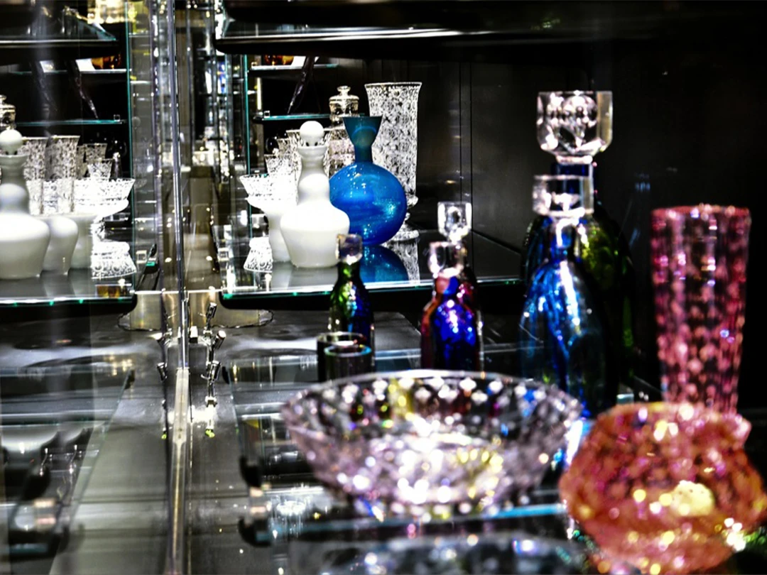 Основа собрания — изделия Ленинградского завода художественного стекла, наследника традиций Императорского стеклянного завода и одного из лидеров советского стекольного производства. Чего здесь только нет: искусные витражи, изящные цветные вазы, статуэтки и, конечно, бокалы из хрусталя.