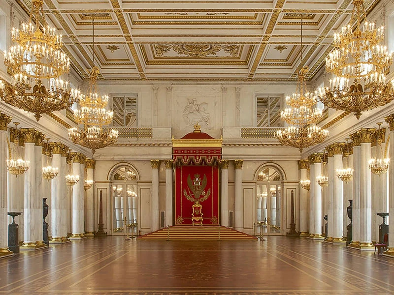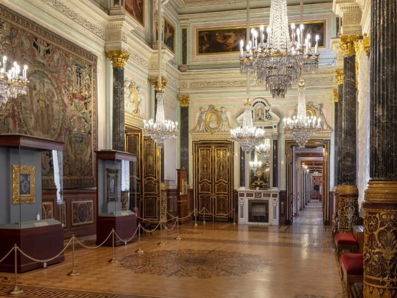 В Зимнем дворце более десятка парадных и камерных помещений: Большой и малый тронные залы, Гербовый и Белый залы, Малахитовая гостиная и другие. Здесь же, в Зимнем, находится зал с египетскими древностями. Одна из них — мумия возрастом более 2500 лет.
