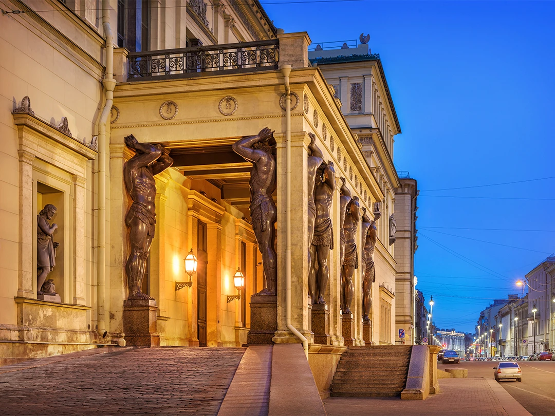 Среди роскошных залов и интерьерных изысков здания отдельного рассказа заслуживает… лестница.Дворяне, собираясь на приём к государю, подъезжали ко входу на набережной, входили в слабо освещённый подъезд, ступали на лестницу — и попадали в просторное, роскошное, яркое помещение с колоннами, статуями, хрустальными люстрами и расписным плафоном размером 19х9 метров.