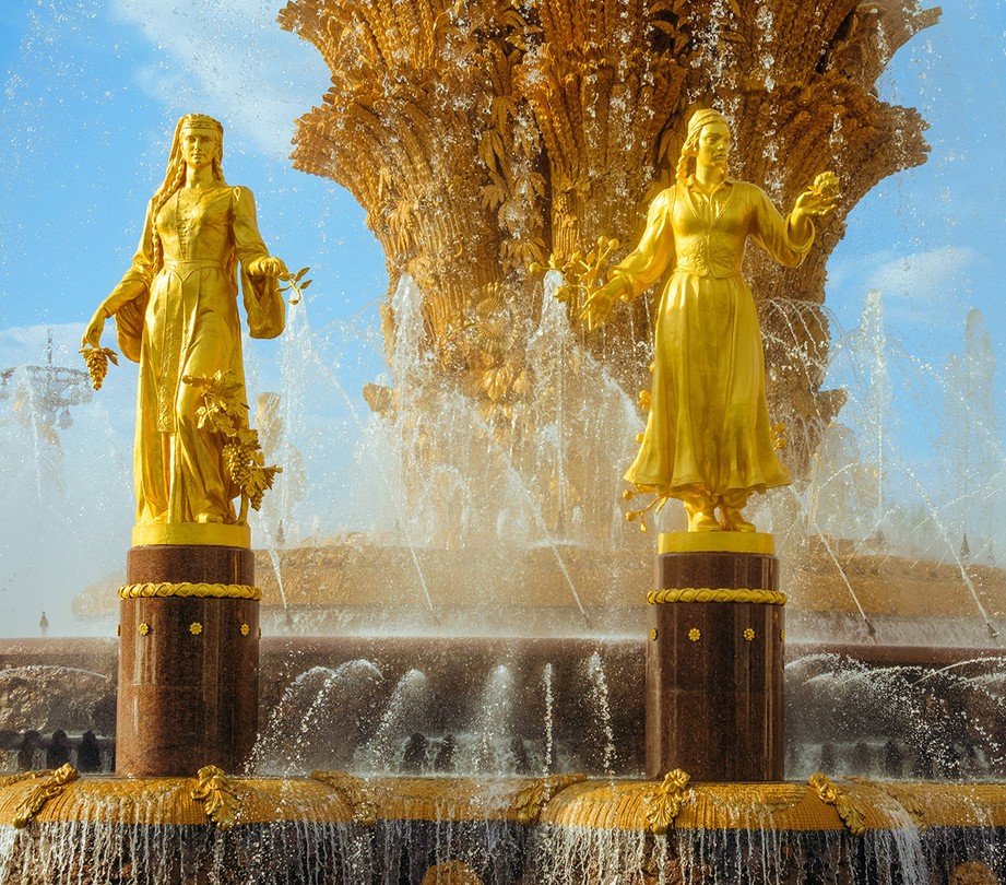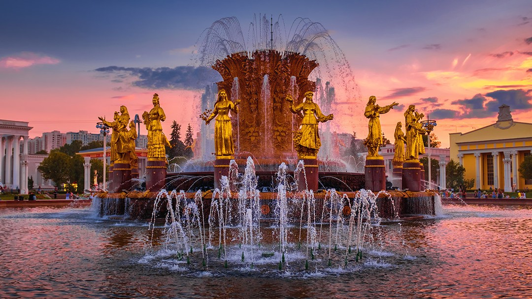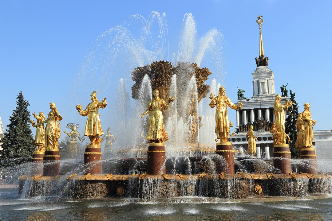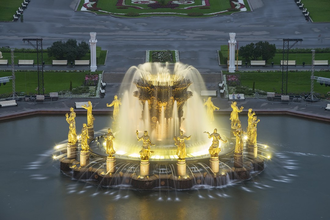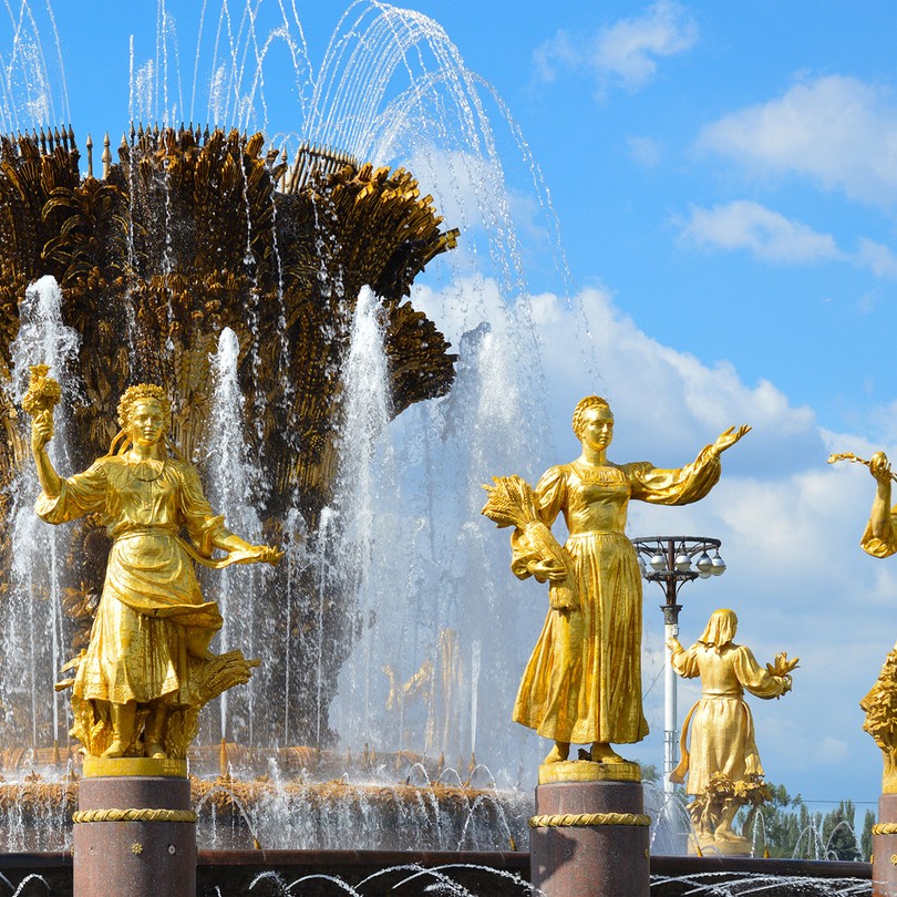 По своему великолепию «Дружба народов» может соперничать с роскошными фонтанами Петергофа. За классными фото сюда лучше приходить летним вечером, когда золотые статуи, окаймлённые струями воды, эффектно подсвечиваются 250 прожекторами. Но можно отправиться к фонтану «Дружба народов» и днём — с одной из экскурсий по ВДНХ с гидами‑москвичами. В их компании прогулка получится не только познавательной, но и максимально интересной: опытные проводники расскажут необычные факты, загадки, связанные с павильонами выставки, и многое другое.