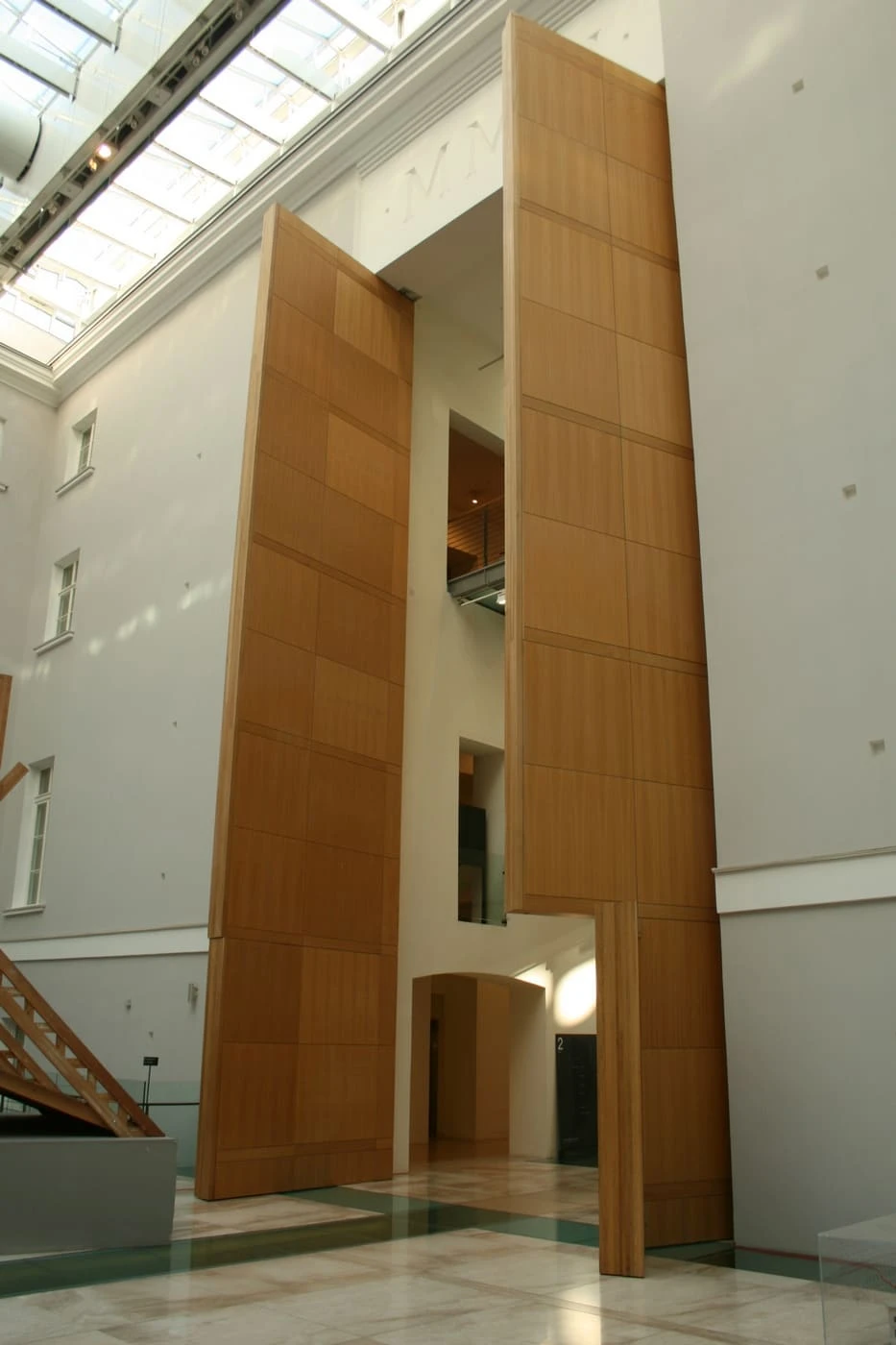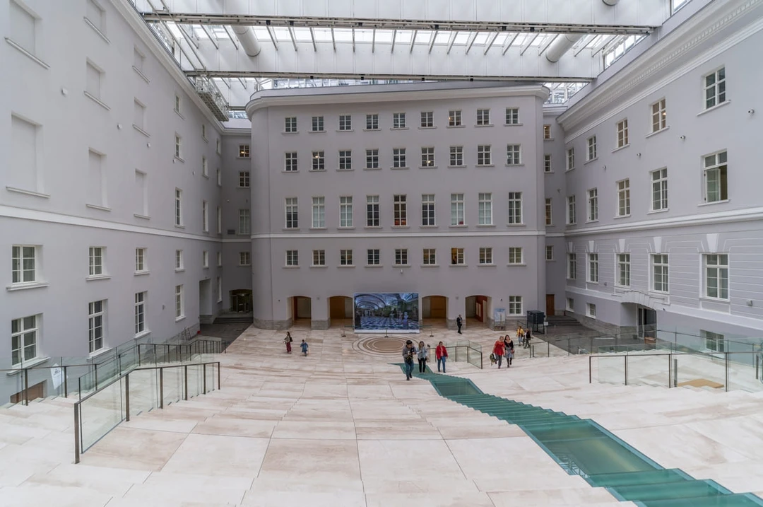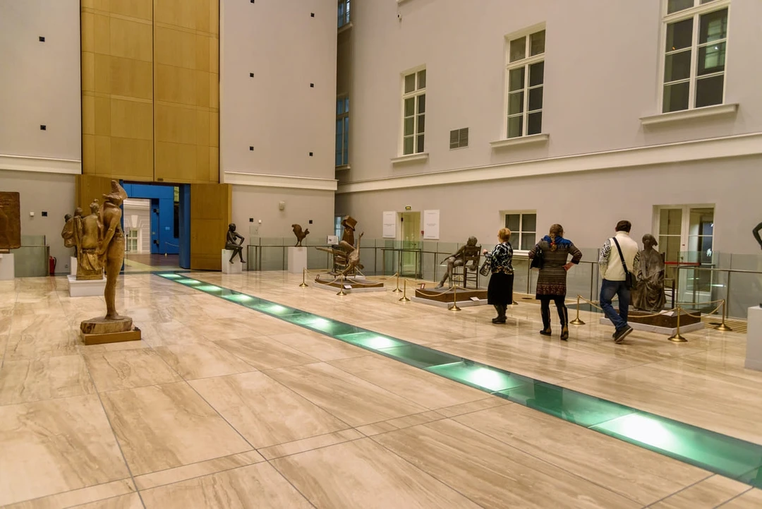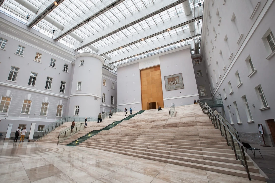 После реконструкции пять внутренних дворов восточного крыла Главного штаба закрыли стеклянным куполом и сделали проход, образовав Новую Большую анфиладу выставочных залов. По сути, это залы‑трансформеры, каждый из которых оснащён световыми фонарями и подвижными стенами, что позволяет менять пространство и освещение в зависимости от задач экспозиции. Кстати, встречает гостей Главного штаба парадная лестница, которая заняла всё пространство первого двора. Во время крупных мероприятий на ступенях расставляют стулья и она превращается в зал‑амфитеатр. А во втором дворе размещается выставка итальянской скульптуры ХХ века, произведения которой были подарены Эрмитажу авторами.
