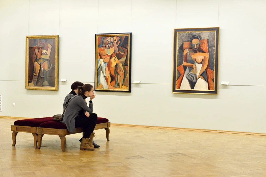 Например, работы Анри Матисса экспонируются в трёх. Это 38 экспрессивных и ярких картин: «Красная комната», «Разговор» и диптих «Музыка» и «Танец». Не менее широко представлены полотна Пикассо, иллюстрирующие все периоды творчества художника. Здесь можно посмотреть на отрешённую «Любительницу абсента» и на полную драматизма картину «Свидание», а также на шедевры кубизма: «Танец с покрывалами» и «Три женщины».