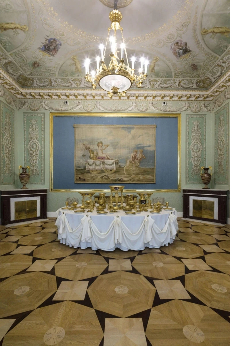 Сейчас здесь экспонируется набор французской золочёной посуды, покрытой живописными изображениями, а также бронзовые вазы для цветов и канделябры с фигурой богини Победы.