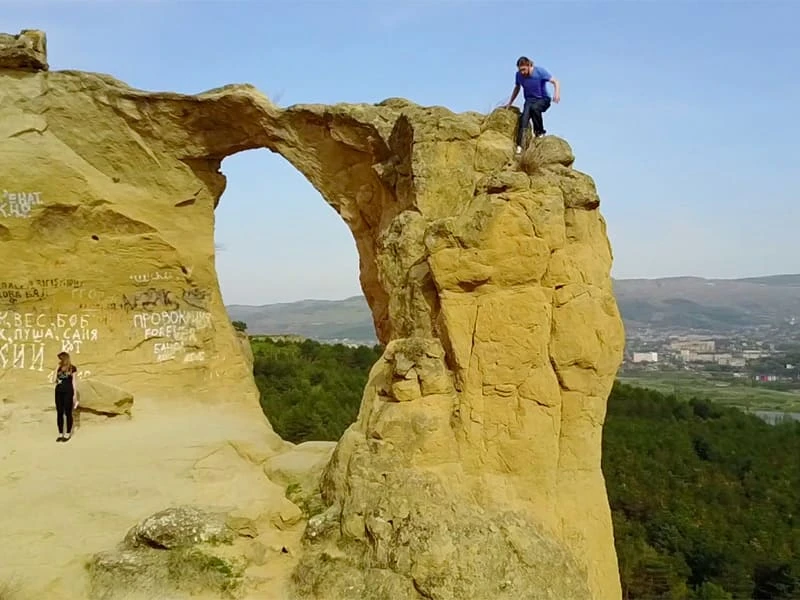Дыра образовалась здесь в результате воздействия ветров и процессов эрозии. Сейчас это популярное у блогеров место, которое окружено легендами. А ещё с горы можно полюбоваться панорамой Кисловодска, увидеть вершины Джинальского хребта и даже Эльбрус. Есть в окрестностях курортного города и другие подобные «кольца», но это — наиболее крупное и известное.