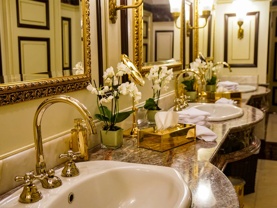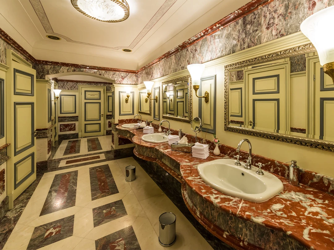 Комнаты туалета делятся на женские и мужские. В женских — сантехника в золотых тонах, в мужских — в серебряных. Вместо привычных бумажных полотенец и электросушилок — хлопковые полотенца.