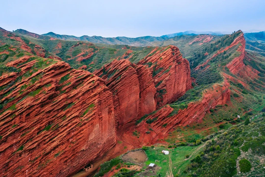 Одна из самых впечатляющих локаций возле Каракола — красное ущелье Джеты‑Огуз, что переводится с киргизского как «Семь быков». На входе в ущелье увидите его самую романтическую достопримечательность — это две скалы в форме разбитого сердца. Вид бурых камней Джеты‑Огуз особенно необычен на фоне зелёных лесов — этот пейзаж изображён на почтовых марках выпуска 1968 года.