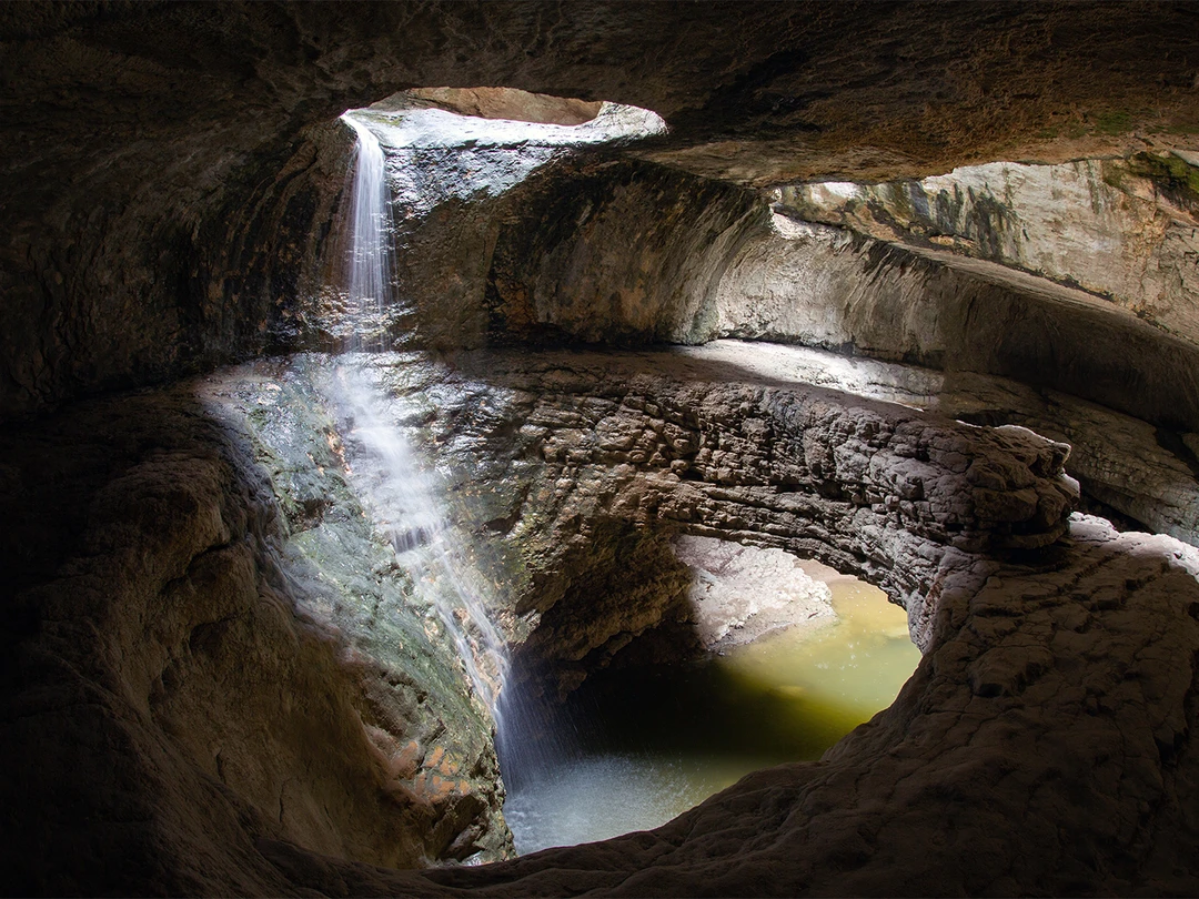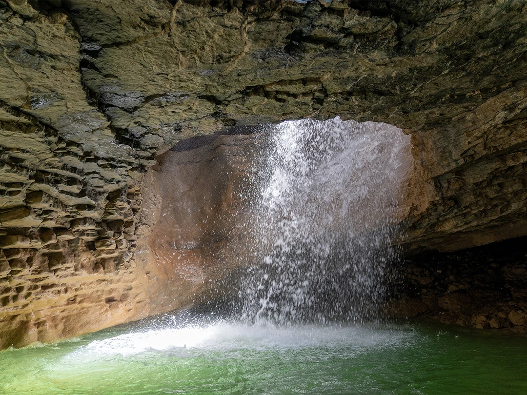 Необычный 20-метровый водопад скрыт в глубине каньона у села Салты. Он расположен в узком скальном разломе, где каменные своды почти смыкаются над потоком. Из‑за этого кажется, что водопад находится под землёй. Солнечный свет, проникая через расщелины, заставляют водяные брызги искриться — это очень красивое зрелище.