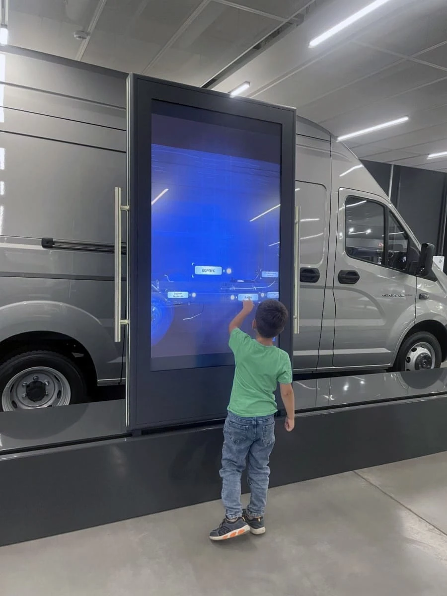 Интерактивная площадка, где легко провести несколько часов, занимает весь третий этаж. Здесь на сенсорных экранах можно собрать машину по собственному проекту и сразу же провести её испытания на виртуальном треке. Или рассмотреть процесс сборки деталей автомобиля на мини‑конвейере.