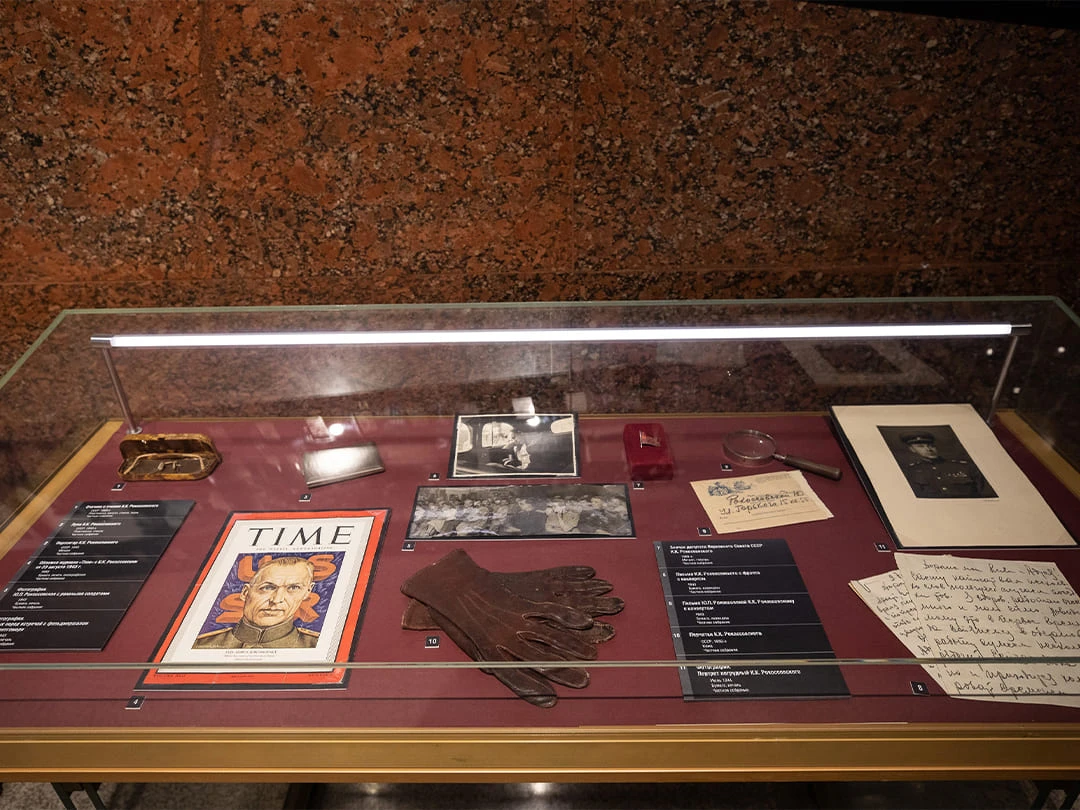 На экранах демонстрируется кинохроника событий 1941-1945 годов, а на стенах можно увидеть фотографии из архивов и личных коллекций. Один из самых запоминающихся экспонатов выставочного зала — настоящий портфель маршала Г. К. Жукова, в котором легендарный военачальник носил секретные документы и карты на встречи со Сталиным.