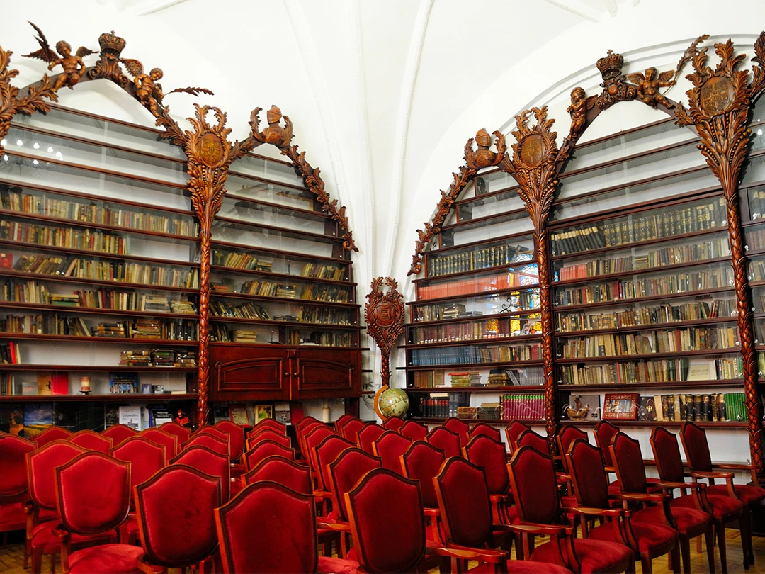 На втором этаже воссоздана часть Валленродской библиотеки — в шкафах с богатой резьбой находятся книги, которые в XVI веке собирал прусский дворянин Мартин фон Валленрод, а потом и его потомки. Большая часть изданий хранятся в европейских библиотеках.